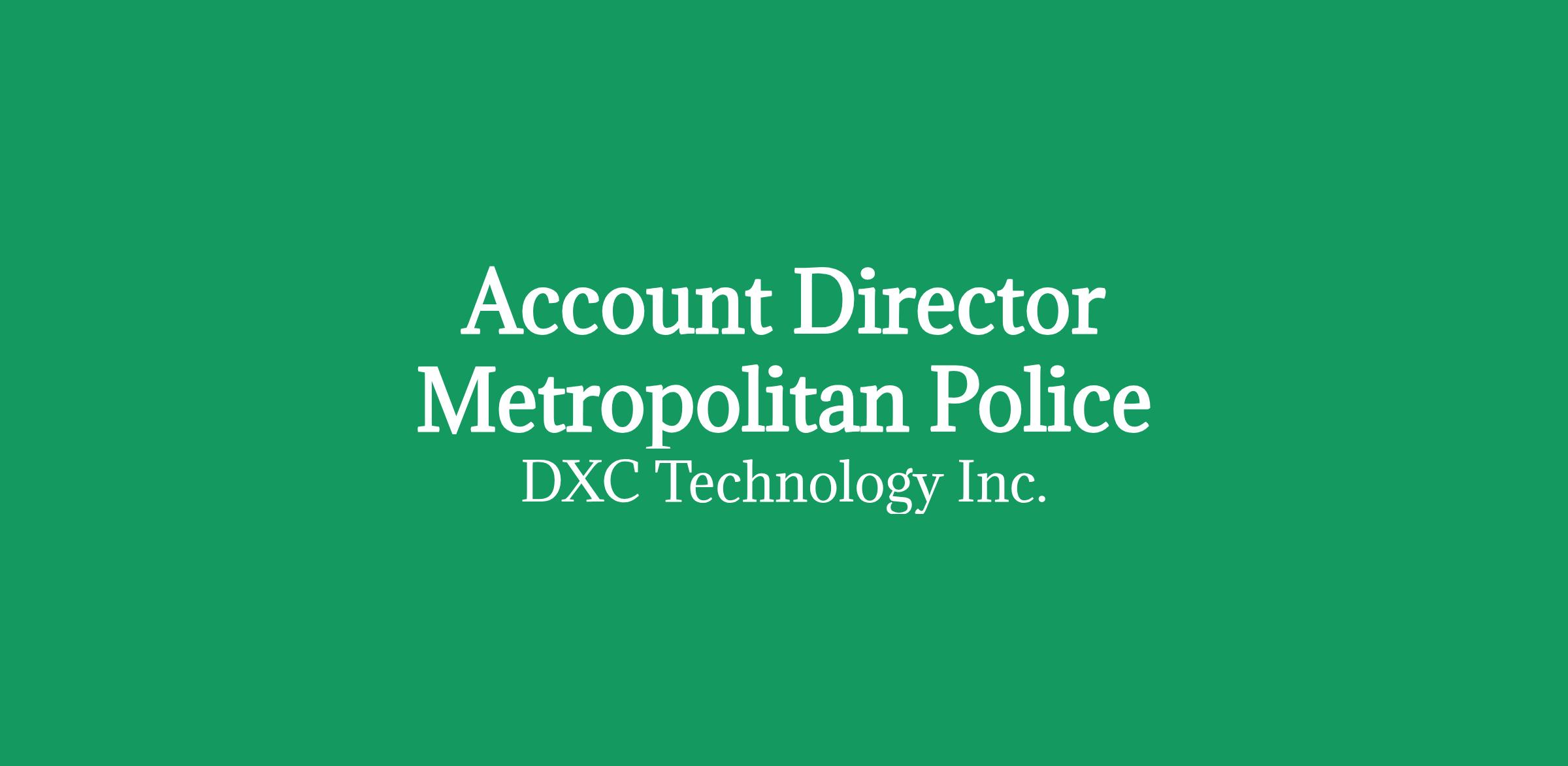 Account Director Metropolitan Police page is loaded Account Director Metropolitan Policelocations: GBR - ENG - LONDON: GBR - ANY CITYtime type: Full timeposted on: Posted Todayjob requisition id: Job Description: DXC is a long-standing technology partner to UK policing and blue light organisations, with deep experience in infrastructure, cloud and managed services. The sector is now looking for partners who can support digital policing, modern applications, data-driven operations and major transformation programmes.We are hiring a Director of Consulting & Engineering Services (CES) to build, lead and scale CES across the UKI Policing and Blue Light sector, with the Metropolitan Police Service as the anchor account. This is a high impact leadership role where you will shape strategy, engage senior policing stakeholders, and grow a consulting and engineering portfolio that directly supports public safety outcomes.This is an opportunity to move DXC from a traditional IT supplier to a trusted strategic partner across the policing and blue light ecosystem. What You'll Do Sector & Account Growth Lead the CES growth strategy for the UKI Policing and Blue Light sector. Identify and win opportunities across engineering, data, AI, analytics and application modernisation. Drive complex sales within public sector and blue light procurement frameworks. Build and manage a quality pipeline that converts into sustainable revenue and margin. Partner closely with ITO and infrastructure leadership to broaden DXC's relevance. Client & Stakeholder Engagement Build trusted relationships with senior policing, operational and command-level leaders. Navigate complex governance, funding cycles and public accountability requirements. Operate as DXC's senior CES representative across the sector, influencing long term decisions. Sector Expertise & Consulting Leadership Bring deep knowledge of UK policing and blue light operations. Understand applications, data and intelligence platforms that support investigations, command-and-control and emergency response. Lead consulting-led conversations that translate public safety outcomes into secure, ethical and resilient technology solutions. Demonstrate strong understanding of data governance, security, ethics and AI in policing. Team Leadership Build and lead a CES team aligned to sector needs. Create a high performance, delivery focused culture. Ensure consistent CES leadership presence across the anchor account and wider sector. Commercial Delivery Own CES revenue, margin and contract outcomes for the sector. Develop commercial models aligned with public sector assurance and value for money expectations. Maintain strong governance throughout the sales and delivery lifecycle. What You'll Bring Senior leadership experience in UK policing, blue light or public safety technology environments. Proven success selling and delivering consulting and engineering services into police forces, emergency services or justice organisations. Strong sales and deal-shaping experience within public sector procurement frameworks. Deep understanding of policing technology, operational resilience and data sensitivity. Strong commercial acumen with an appreciation of public accountability. Established relationships and credibility within the UK policing and blue light ecosystem. Background likely from a major IT services provider with direct sector expertise. Success Measures Establishing a visible and credible CES leadership presence within the MPS within 6 months. Converting CES opportunities into contracted work aligned to policing and blue light priorities. Expanding CES engagement across additional police forces and blue light organisations. Building strong client trust in DXC as a strategic partner supporting public safety outcomes.At DXC Technology, we believe strong connections and community are key to our success. Our work model prioritizes in-person collaboration while offering flexibility to support wellbeing, productivity, individual work styles, and life circumstances. We're committed to fostering an inclusive environment where everyone can thrive.Recruitment fraud is a scheme in which fictitious job opportunities are offered to job seekers typically through online services, such as false websites, or through unsolicited emails claiming to be from the company. These emails may request recipients to provide personal information or to make payments as part of their illegitimate recruiting process. DXC does not make offers of employment via social media networks and DXC never asks for any money or payments from applicants at any point in the recruitment process, nor ask a job seeker to purchase IT or other equipment on our behalf. More information on employment scams is available . locations: 2 Locationstime type: Full timeposted on: Posted TodayDXC Technology (NYSE: DXC) helps global companies run their mission-critical systems and operations while modernizing IT, optimizing data architectures, and ensuring security and scalability across public, private and hybrid clouds. The world's largest companies and public sector organizations trust DXC to deploy services to drive new levels of performance, competitiveness, and customer experience across their IT estates. Learn more about how we deliver excellence for our customers and colleagues at .
