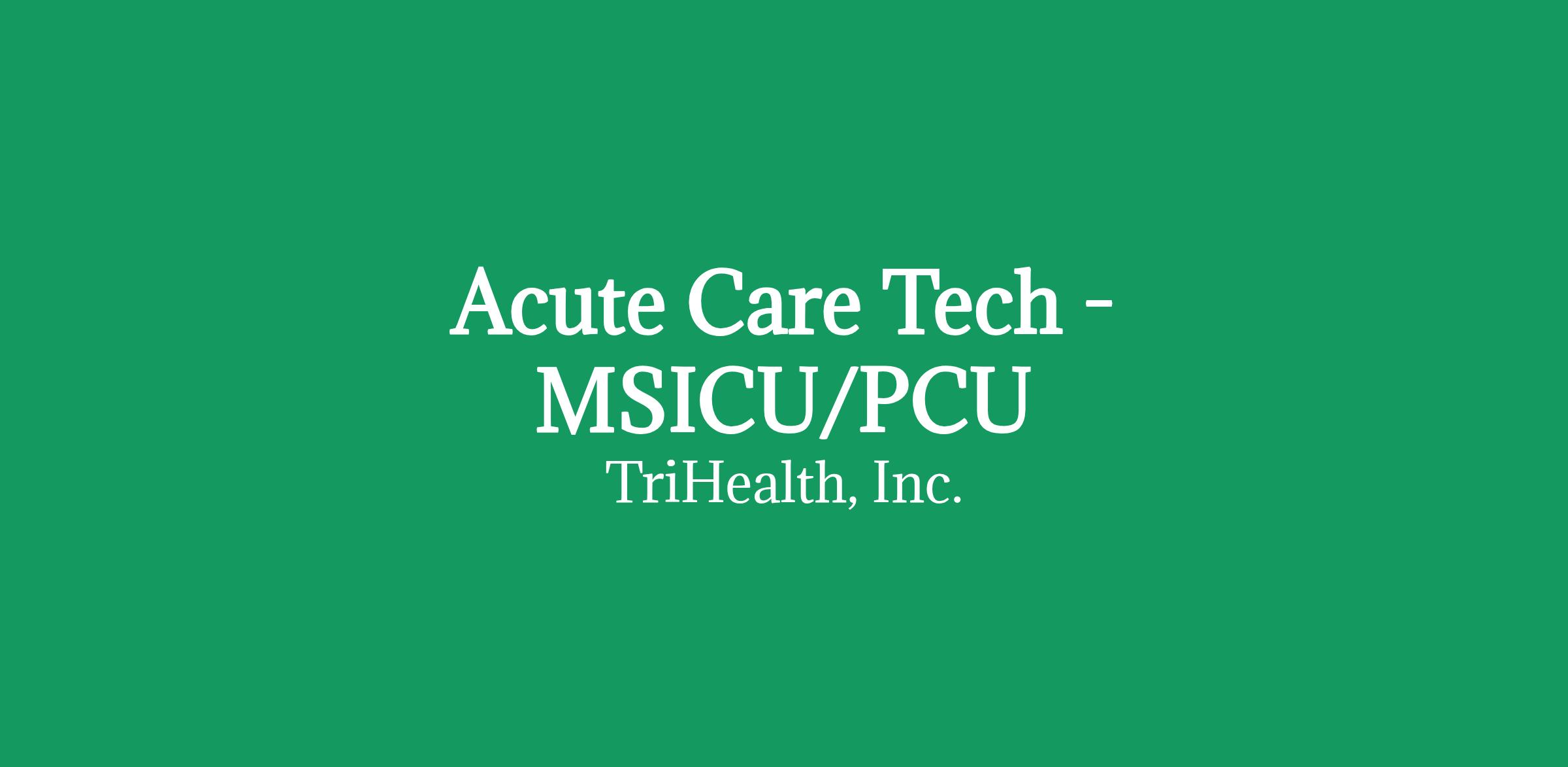 TriHealth is committed to fostering a culture where every team member is heard, supported, and empowered to provide exceptional care. As an Acute Care Tech in the MSICU/PCU, you will support nurses and clinical staff in delivering high quality, compassionate care to patients with high acuity needs. Your work ensures safe, efficient operations and contributes directly to patient outcomes and the overall care experience. Job Overview: This position provides assistance and/or performs basic activities of daily living and specified treatments and procedures under the direct supervision of the nurse. May perform non-direct patient care activities as assigned, requested, or directed including but not limited to stocking and clerical activities.