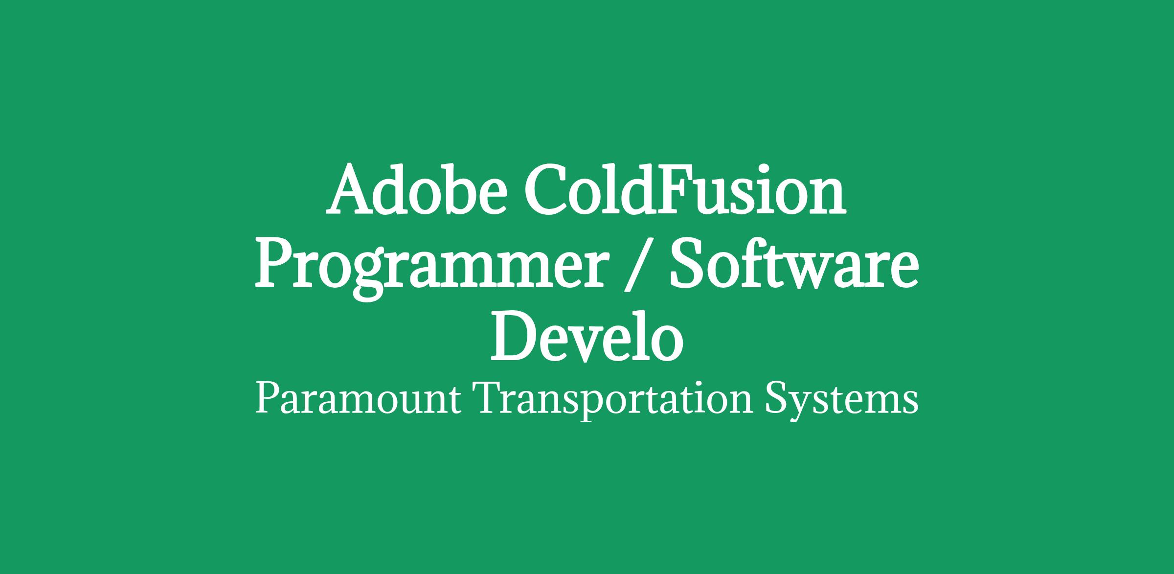 Paramount Transportation Systems, Inc. is seeking an experienced Adobe ColdFusion Programmer / Software Developer to join our team at our worldwide headquarters located in San Marcos, CA. The ideal candidate will work with a team to design, implement, and support our in-house websites and applications. This is an onsite position.
