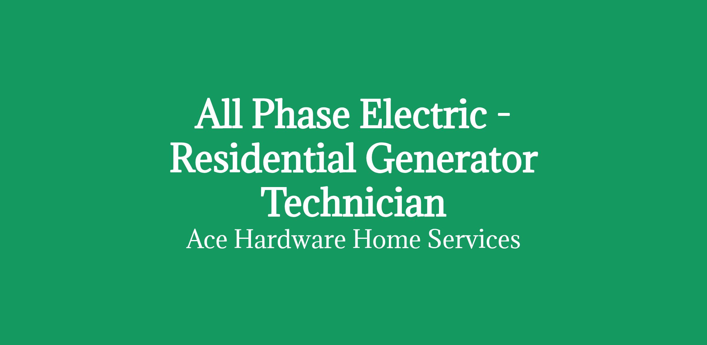 Job Description: Who we are All Phase Electric is now an Ace Hardware Company. At Ace Hardware Home Services, we are backed by a brand that customers have trusted for over 100 years. You can trust that you can build a career you will be proud of. A career with excellent income, a consistent work schedule and opportunities for advancements. Your essential contributions will be appreciated, respected, and rewarded. Here you won't just "have a job," you will be helping us to reshape the future of home services by providing reliable, best-in-class service to your neighbors in your community.