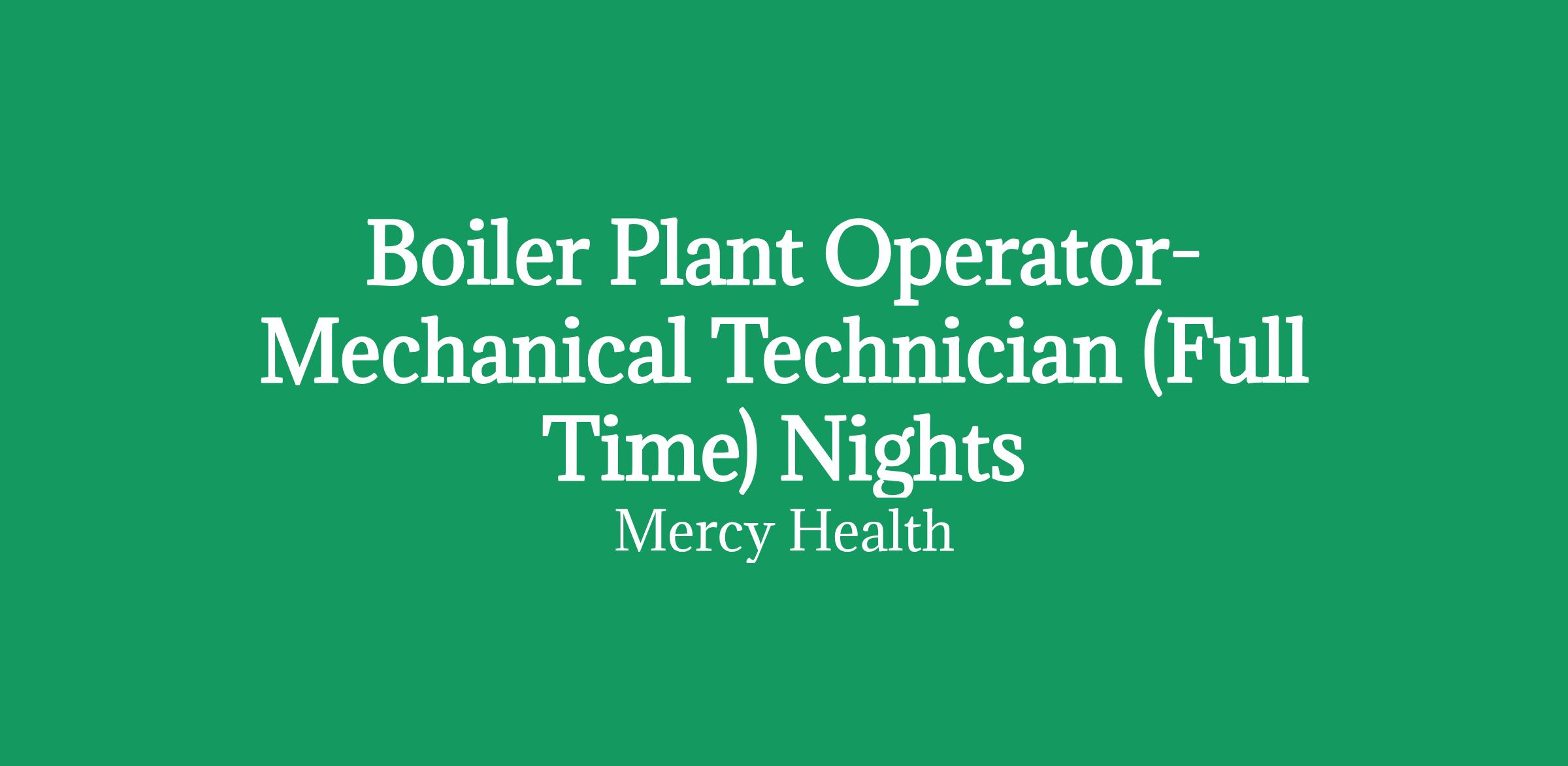 Find your calling at Mercy! This is an exciting skilled position requiring basic to advanced knowledge of boiler, HVAC, refrigeration, electrical distribution, and control system maintenance and operation. The position will support a large hospital campus. The Boiler Plant Operator - Mechanical Technician provides the necessary skills to monitor, operate, maintain, and repair various central utility plant and campus support electro-mechanical systems. Utilizing exceptional customer service, communication and mechanical skills you will ensure a safe working environment and support an exceptional Environment of Care for Mercy patients, staff and guests.