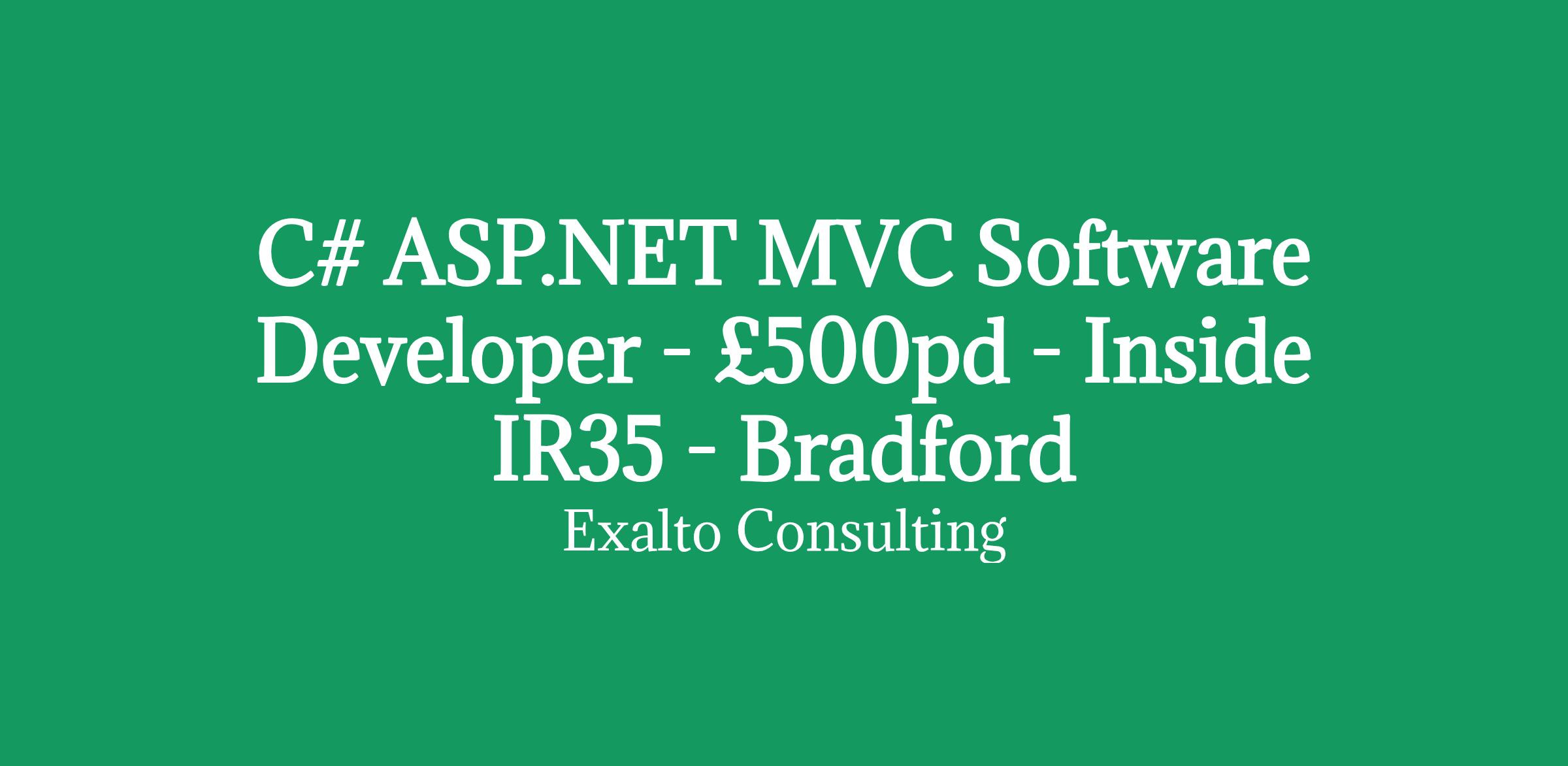 C# ASP.NET MVC Software Developer - £500pd - Inside IR35 - 9 month contract Bradford (Hybrid - 2 days onsite in Bradford per week) Exalto Consulting is supporting a long standing client as they look to welcome a C# ASP.NET MVC Software Developer to their team.
