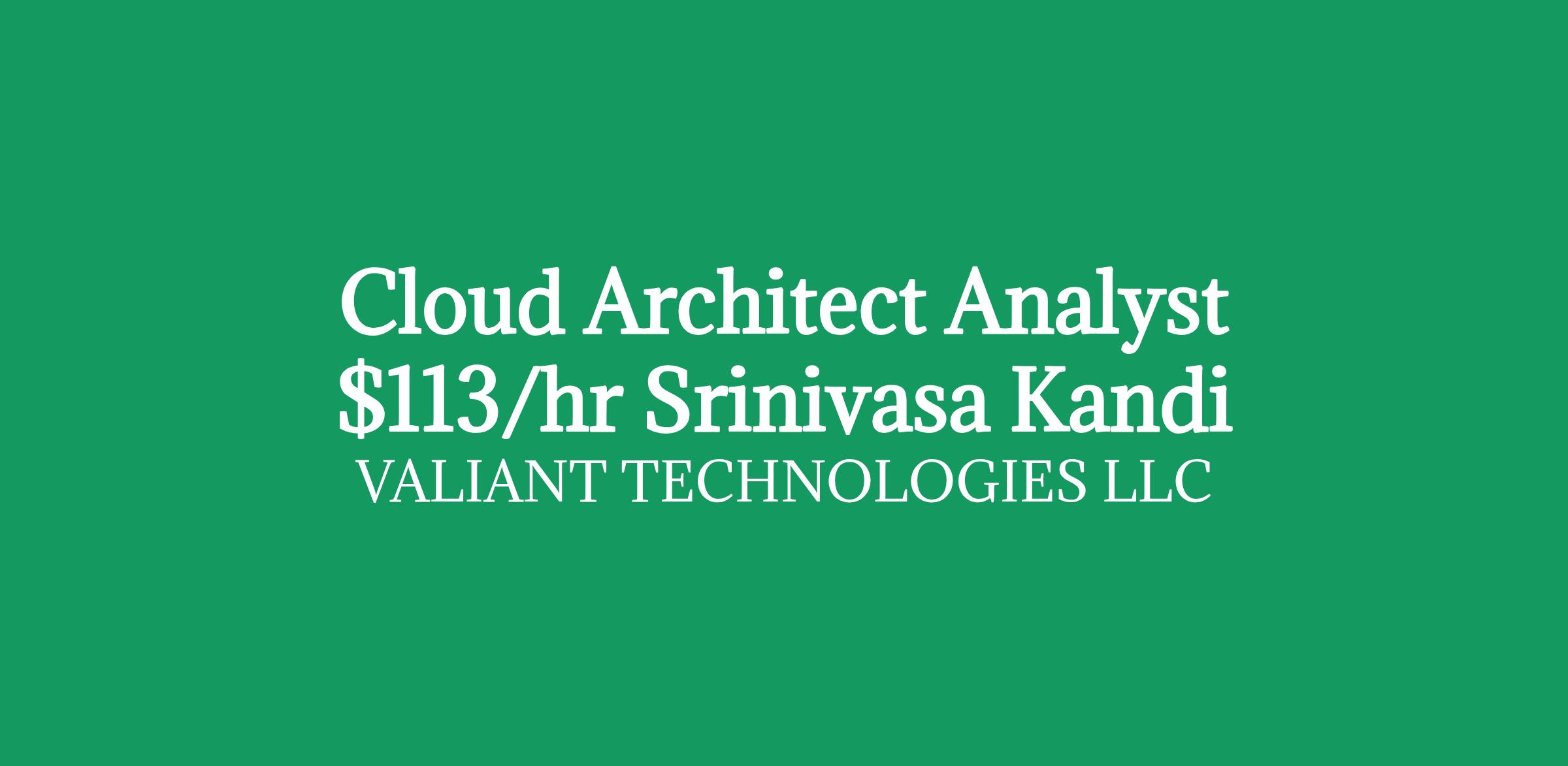 Role: Cloud Architect Analyst Bill Rate: $113/hour C2C Location: Chapel Hill, NC Duration: 12+ months/ long-term Interview Criteria: Telephonic + Skype Direct Client Requirement Develop and implement comprehensive cloud architecture strategies that align with business objectives and technological advancements. Leverage your in-depth knowledge of cloud and other architectural frameworks to design scalable and efficient cloud solutions. Provide industry, technology, and market expertise to support strategic business decisions for cloud investments. Decompose complex business strategies into initiatives that translate into clear, actionable cloud architecture roadmaps. Collaborate across organizational silos to resolve dependencies and accelerate cloud architecture and solution decisions. Work with cross-functional teams to identify opportunities for cloud adoption, streamline processes, and enhance operational efficiency. Apply your expertise in cloud architecture principles to ensure seamless integration of cloud solutions into existing systems and workflows. Lead the evaluation and selection of emerging cloud technologies, ensuring alignment with business requirements and industry standards. Provide technical guidance and leadership to development teams, ensuring compliance with cloud architectural standards and best practices. Define governance and security practices for cloud initiatives, ensuring adherence to industry regulations and company policies. Monitor and evaluate the performance of implemented cloud solutions, continuously making improvements as necessary. Share your knowledge and insights on cloud architecture principles across the organization to foster innovation and best practices. Note: If you are interested, please share your updated resume and suggest the best number & time to connect with you. If your resume is shortlisted, one of our IT Recruiter from my team will contact you as soon as possible Srinivasa Reddy Kandi Client Delivery Manager Valiant Technologies LLC Equal Opportunity Employer: We are an equal opportunity employer. All aspects of employment including the decision to hire, promote, discipline, or discharge, will be based on merit, competence, performance, and business needs. We do not discriminate based on race, color, religion, marital status, age, national origin, ancestry, physical or mental disability, medical condition, pregnancy, genetic information, gender, sexual orientation, gender identity or expression, national origin, citizenship/ immigration status, veteran status, or any other status protected under federal, state, or local law