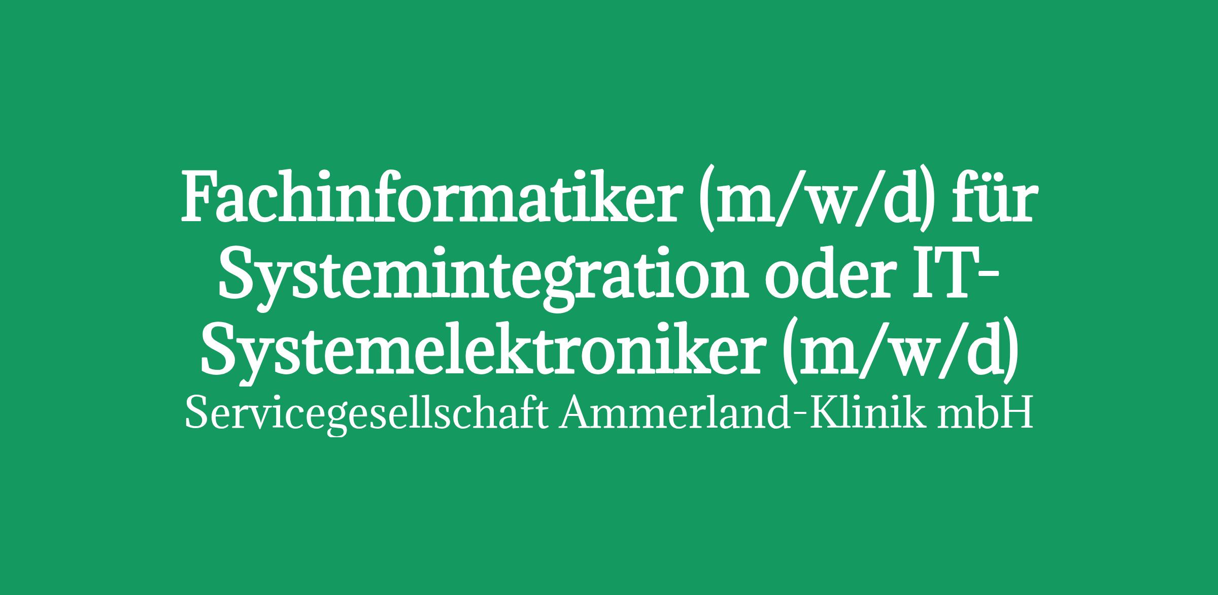 Fachinformatiker für Systemintegration oder IT-Systemelektroniker Bei uns zählt der Mensch, nicht das Geschlecht. Deine Aufgaben bei unsDie Servicegesellschaft Ammerland-Klinik mbH ist eine hundertprozentige Tochter der Ammerland-Klinik GmbH und erbringt für diese am Standort Westerstede verschiedenste Dienstleistungen. Hierzu gehören medizinisch-technische, hauswirtschaftliche und verwaltungstechnische Dienste, das technische Gebäude- und Gerätemanagement sowie die ärztliche Assistenz. In der Ammerland-Klinik engagieren sich rund 1.500 Mitarbeitende für die Menschen aus der Region und weit über die Grenzen des Landkreises hinaus.