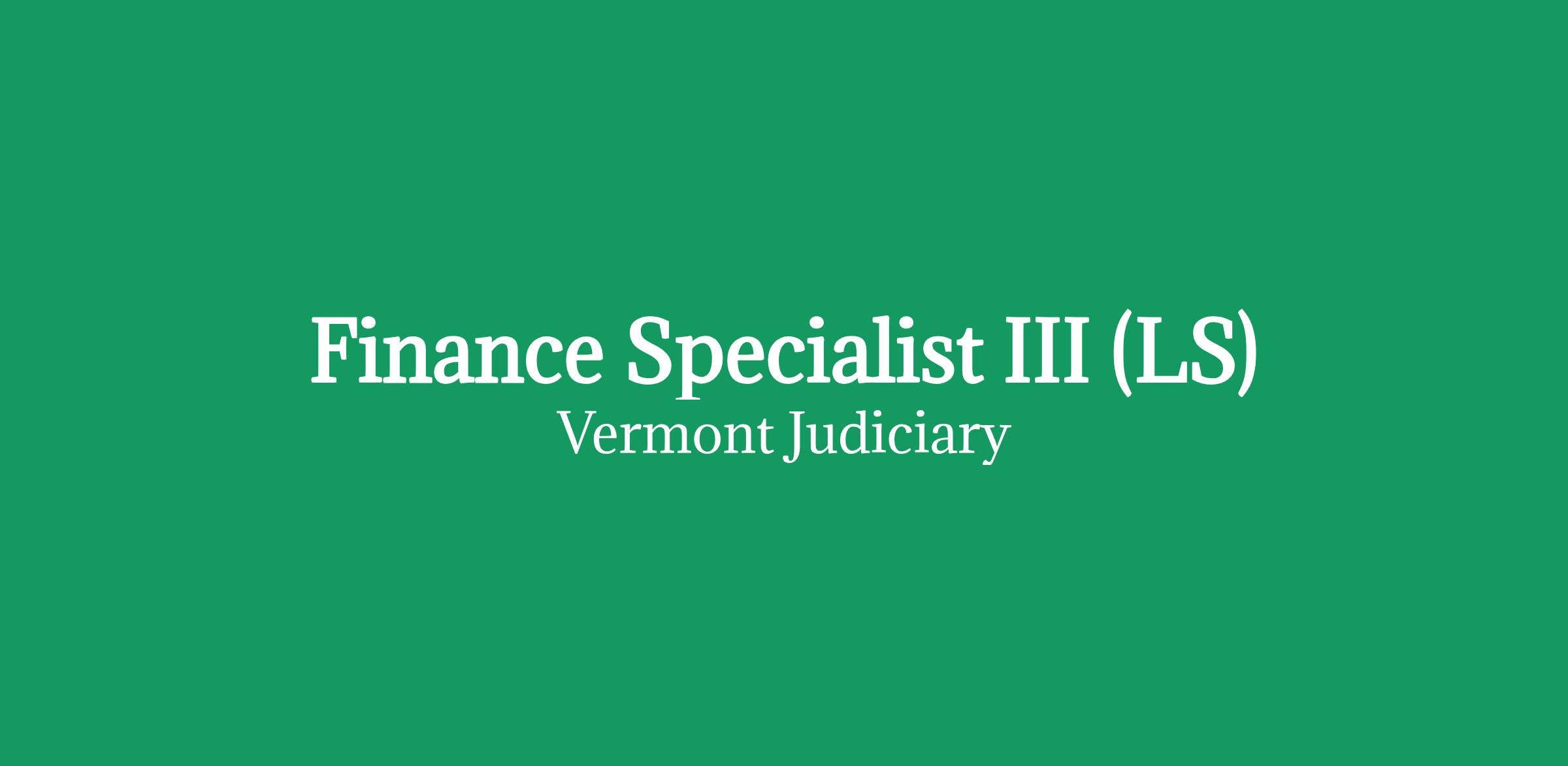 This is a limited-service full-time position located in Montpelier, Vermont. Upon completion of an initial training period, the employee can request a Vermont-based hybrid work schedule. Starting salary is $24.59 per hour. The limited-service term will end 12/31/2028. The Finance Specialist III is a non-exempt Judicial Branch position equivalent to pay grade 21. The State of Vermont's total compensation package features an outstanding set of employee benefits that are worth about 30% of your total compensation.