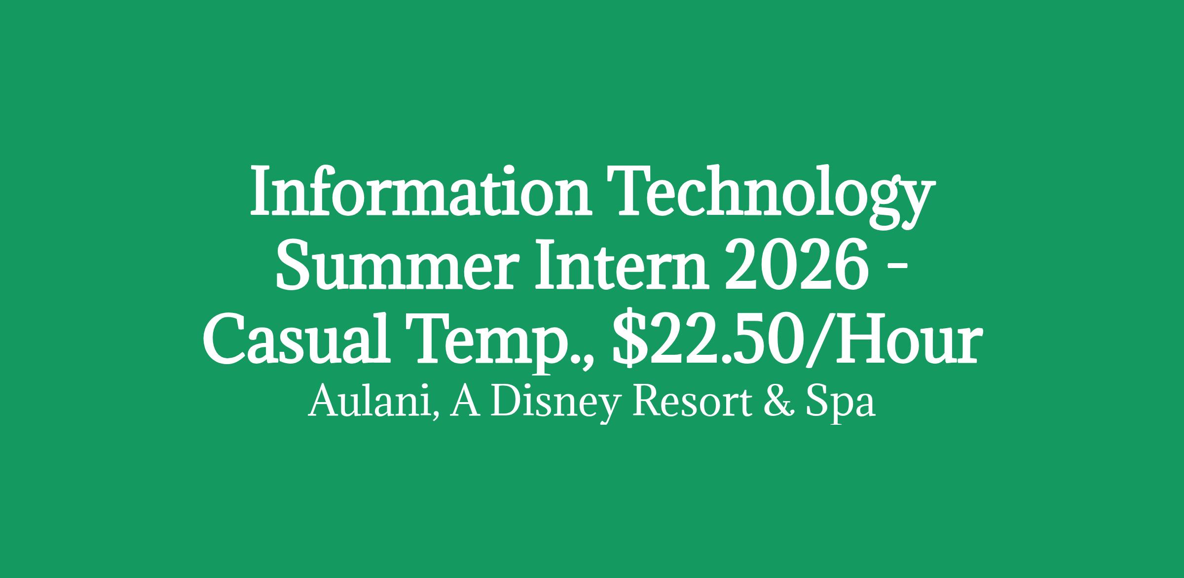 Looking for ways to expand your resume by building a network of connections and gaining valuable work experience? Apply for the IT Summer Internship role where you will have the chance to fully experience and create the Disney magic. The IT Intern (Technology Deployment) is a temporary, project-based role supporting the resort's network modernization initiative, including upgrades to GPON infrastructure, enterprise Wi-Fi access points, and IPTV equipment. This role provides structured, hands-on exposure to large-scale technological deployments in a hospitality environment. Responsibilities focus primarily on equipment staging, physical installation support, and basic operational validation under the direct supervision of the Information Technology team. The intern may perform limited basic provisioning or initial device setup tasks using predefined procedures, such as entering device identifiers, selecting predefined configuration templates, or initiating activation steps. These activities are strictly procedural and performed under supervision. The IT Intern is not responsible for advanced configuration, troubleshooting, diagnostics, system administration, or network engineering activities. This internship is a full-time commitment, between the months of May 2026 through August 2026. Must be available to work 8:00am - 4:00pm, up to 40 hours per week. Responsibilities : The IT Intern will provide onsite deployment assistance in support of the resort's network equipment upgrade initiative. Duties are operational and task-focused, emphasizing safety, efficiency, and adherence to installation standards. Equipment Staging & Preparation Load and organize deployment carts with required equipment and materials Stage wireless access points (APs), IPTV set-top boxes (STBs), and GPON ONTs Verify equipment quantities and prepare devices per project instructions Transport equipment and supplies to assigned deployment areas Equipment Removal & Installation Remove existing AP, STB, and ONT equipment as directed Install and secure new equipment in designated locations Use step ladders (up to 8 feet) following all safety protocols Ensure proper cable seating and basic organization within cabinets Maintain cleanliness and minimize disruption in guest areas Basic Setup & Validation Enter or verify device identifiers in tracking systems Perform basic activation or setup steps using approved procedures Confirm power, indicator lights, and physical connectivity Report completion status and room numbers to supervising technicians a text-decoration: none; color: ; tr th, tr td border: 1px solid ; tr th background-color: ; Basic Qualifications : Current student or recent graduate within the past 6 months in IT or related field (preferred) Comfortable with physical, hands-on work Able to safely use ladders up to 8 feet Detail-oriented and able to follow instructions Reliable and professional Preferred Qualifications: Additional Information : SCHEDULE AVAILABILTY Summer Casual Temporary - This internship is a full-time commitment, between the months of May 2026 through August 2026. Must be available to work 8:00am - 4:00pm, up to 40 hours per week. SUBMITTING YOUR APPLICATION After clicking "Apply for this job" below, the employment application will open in a new window. Please complete ALL pages of the application by clicking "Next" on each page, then "Submit" on the final page. Keyword: AulaniCasting, Aulani Casting, Housekeeping The pay rate for this role in Hawaii is $22.50 per hour. Select benefits may be provided as part of the compensation package, such as medical, financial, and/or other benefits, dependent on the level and position offered. To learn more about our benefits visit: benefits.