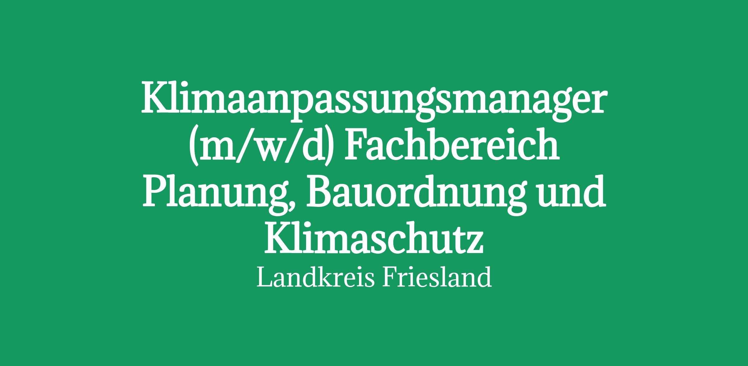 Mit dem neu beschlossenen Klimaanpassungskonzept des Landkreises Friesland werden bisherige Ansätze zum Umgang mit dem Klimawandel verstetigt und eine Reihe neuer Maßnahmen initiiert. Zur Unterstützung bei der Umsetzung und zur Ergänzung seines Klima-Teams im Sachgebiet Planung, Mobilität und Klimaschutz sucht der Landkreis Friesland nun einen Klimaanpassungsmanager (m/w/d).