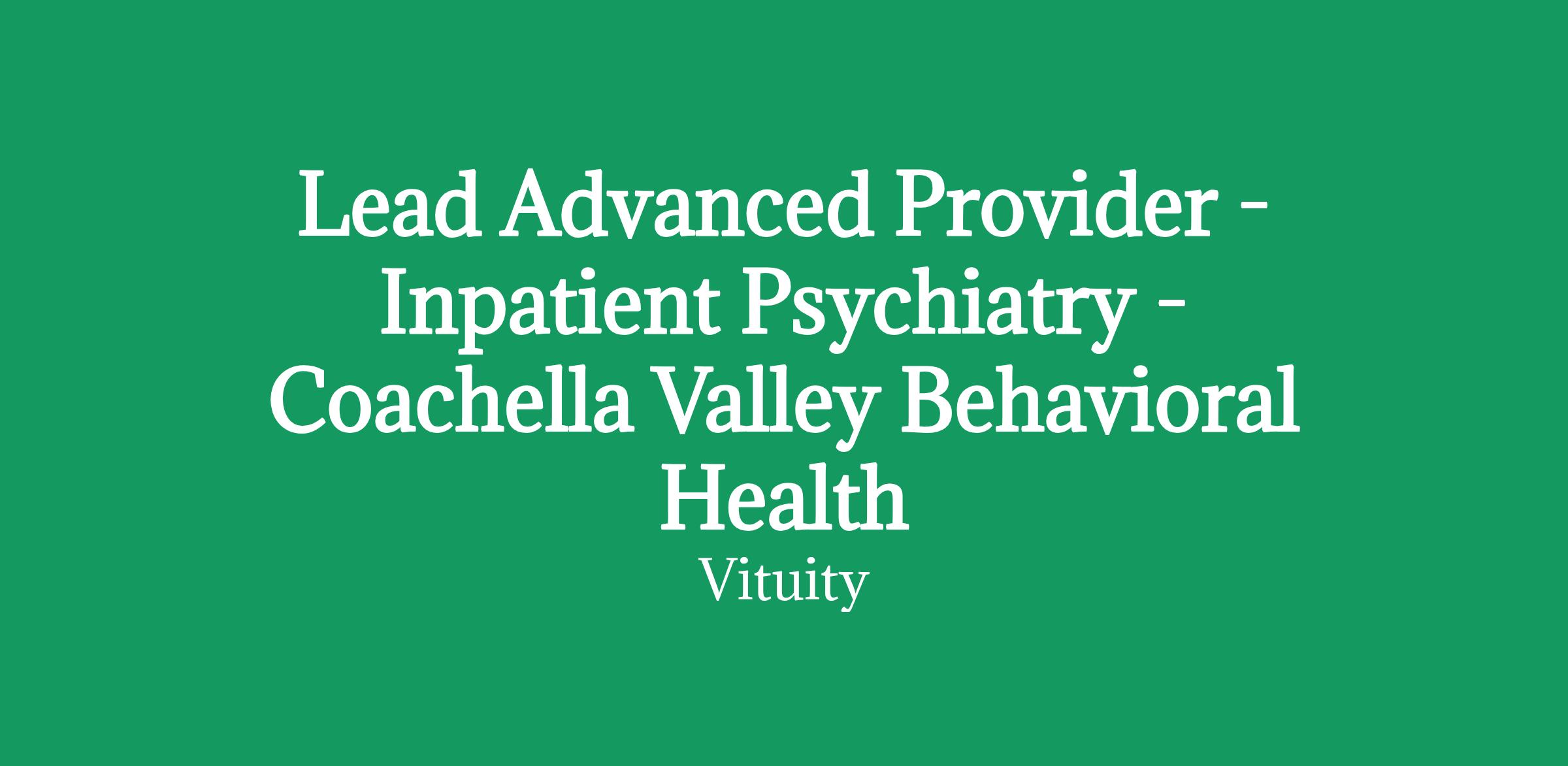 Indio, CA - Seeking Inpatient Psychiatry Advanced Provider Leads Become a Valued Member of Your Inpatient Psychiatry Team As a Lead Advanced Provider, you play a critical role in our mission to improve lives in Inpatient Psychiatry and are a valued member of the full care team. At Vituity we know the impact you can have.