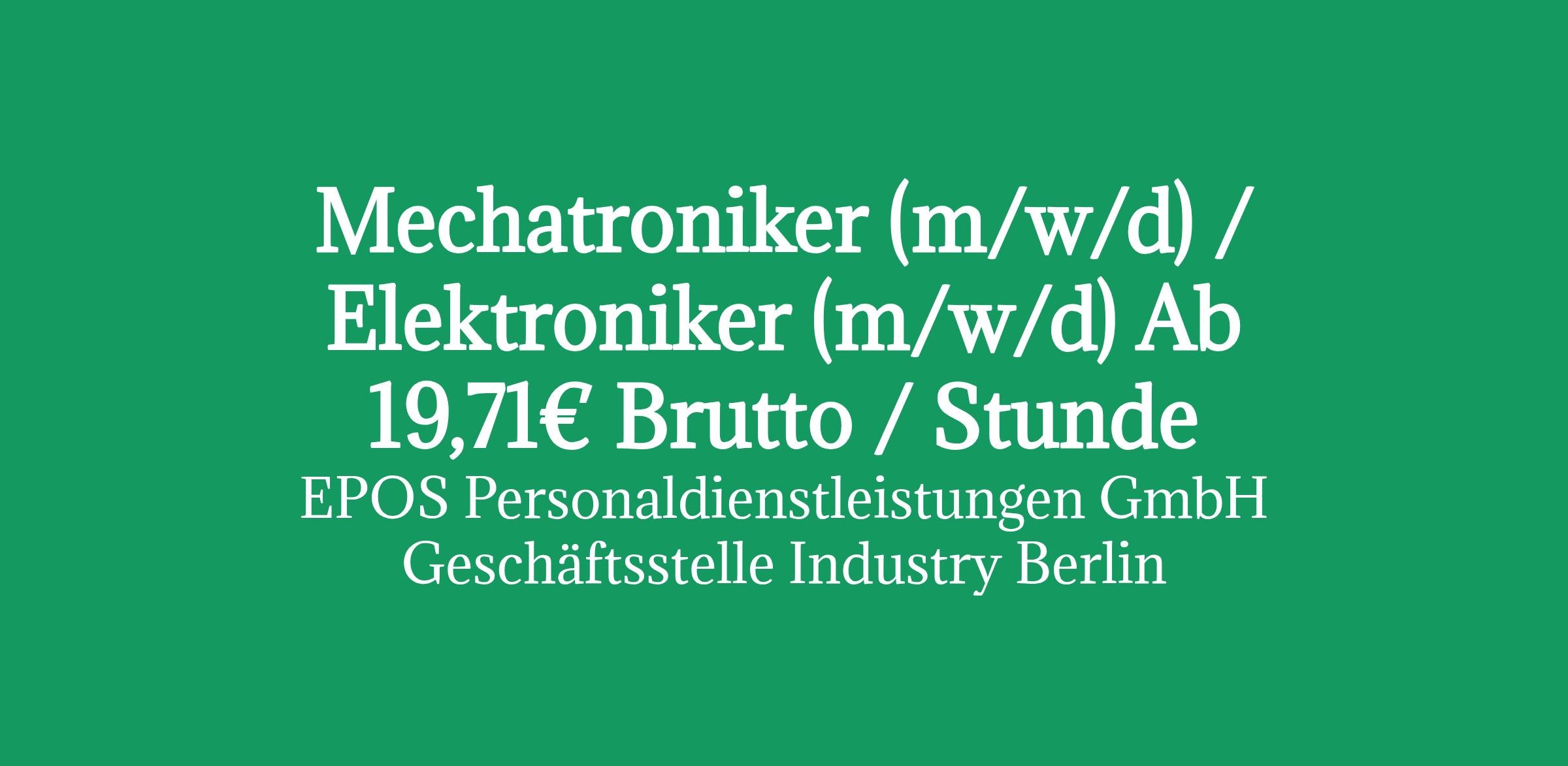 Wir suchen für ein Unternehmen aus der Hauptstadt im Bereich Gerätebau zum nächstmöglichen Zeitpunkt und im Rahmen der Arbeitnehmerüberlassung einen engagiertenMechatroniker (m/w/d) / Elektroniker (m/w/d) ab 19,71€/hin Vollzeit.(Kennziffer: 10-3251)