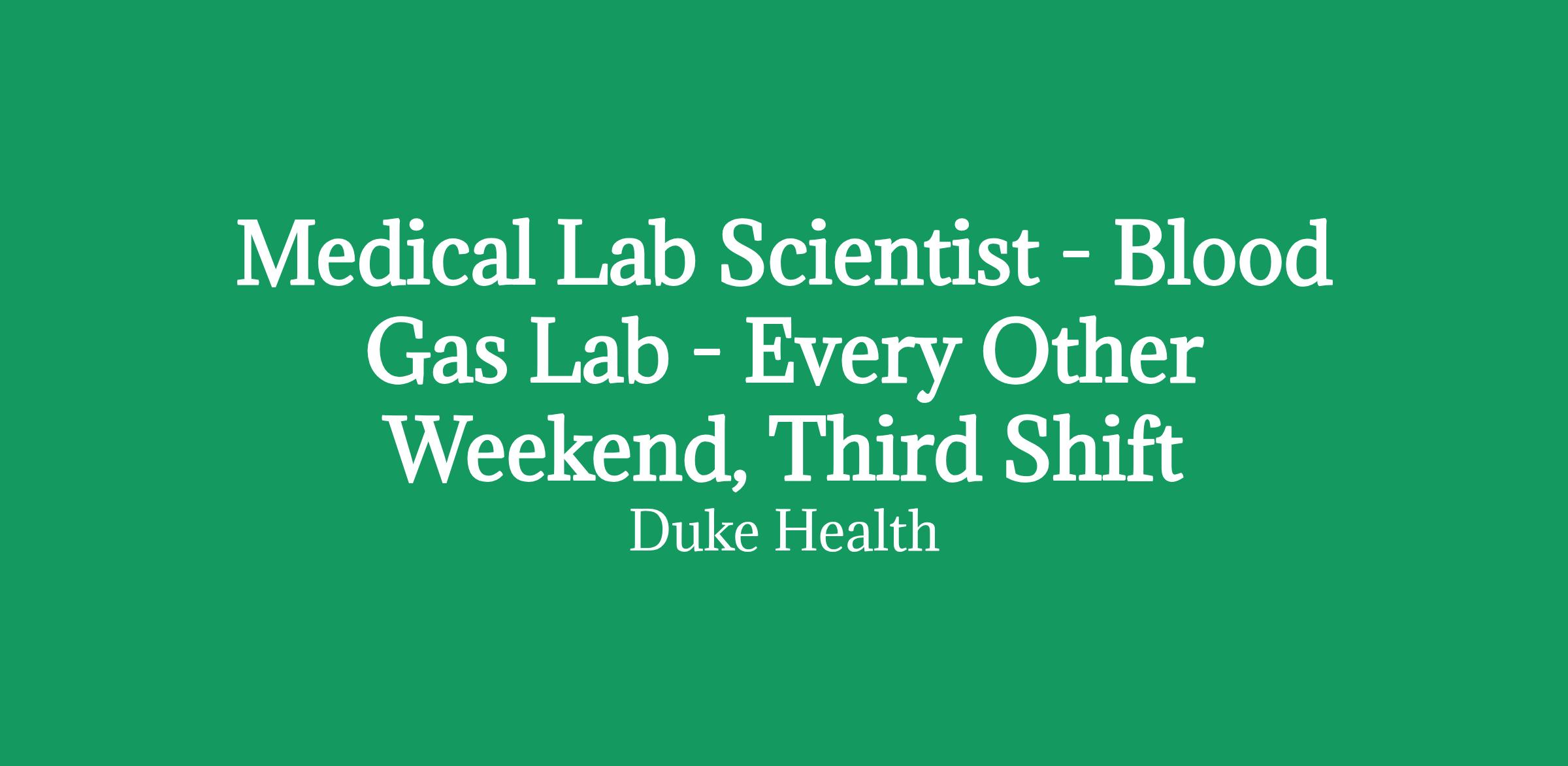 Medical Lab Scientist in the Blood Gas Lab at Duke University Hospital. Every Other Friday and Saturday, 11:00 p.m. - 7:30 a.m.