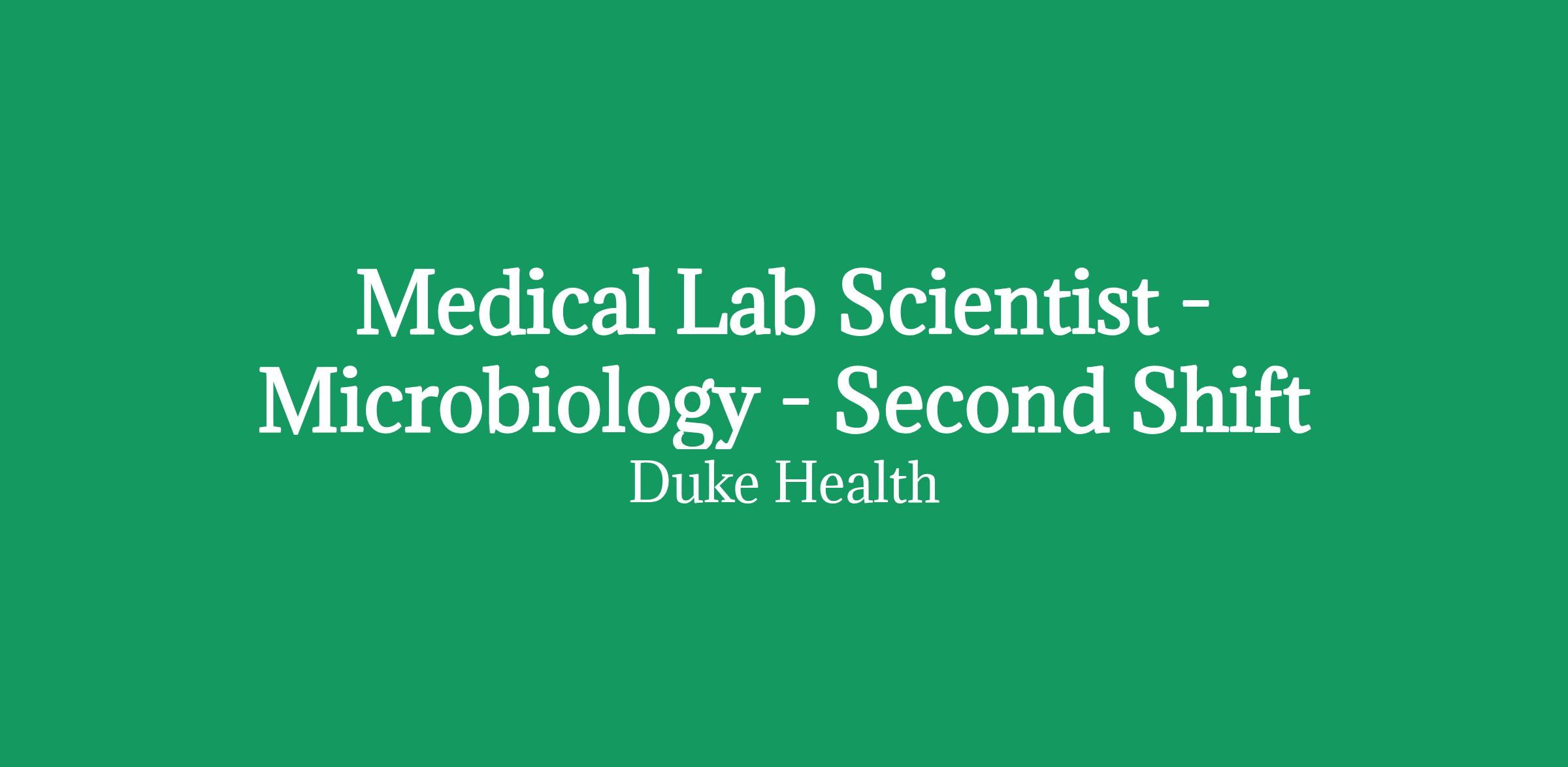 Medical Lab Scientist in the Microbiology Lab at Duke University Hospital. Monday - Friday, 3:00 p.m. - 11:30 p.m., with rotating weekends.