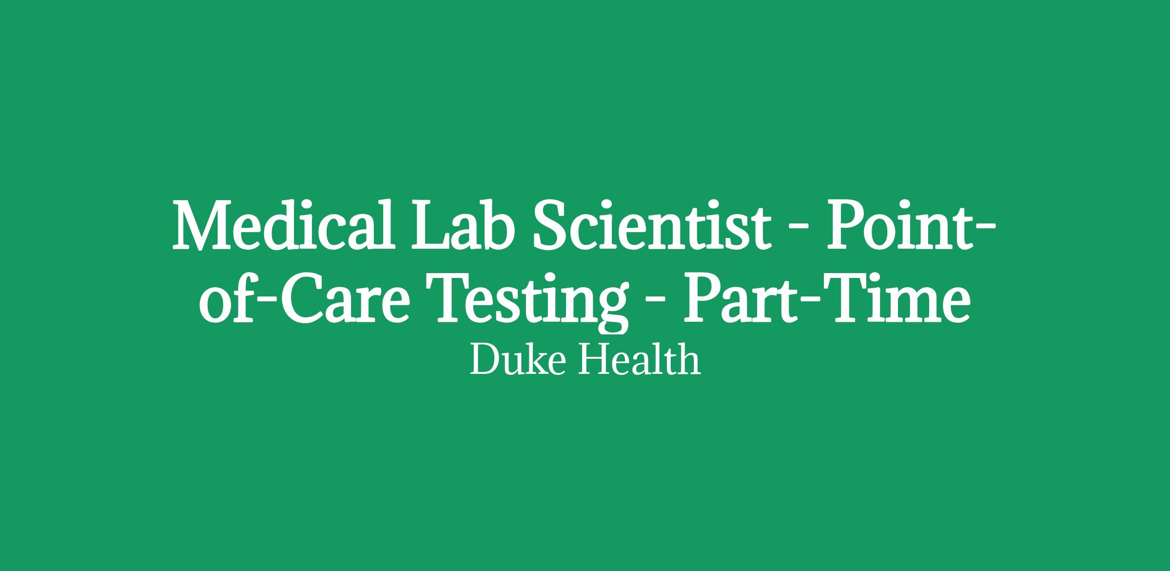Medical Lab Scientist in Point-of-Care Testing at Duke Raleigh Hospital, a campus of Duke University Hospital. Monday - Friday, 9:00 a.m. - 1:00 p.m.