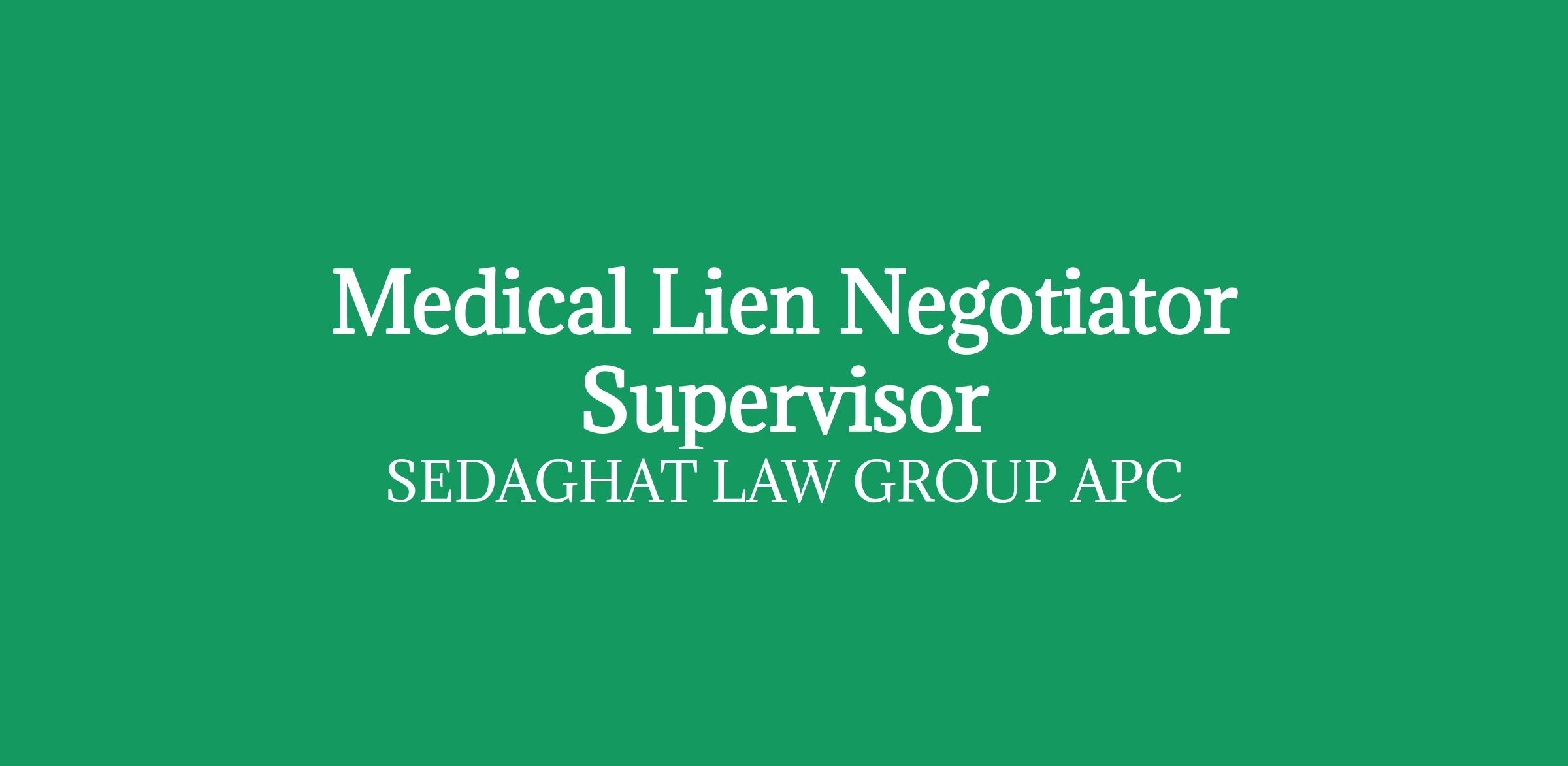A busy, well-respected, personal injury law firm in Beverly Hills seeks a hands on, full-time experienced and well-mannered Medical Lien Negotiator Supervisor to join our growing Personal Injury Law Firm. Experience in a personal injury law firm is