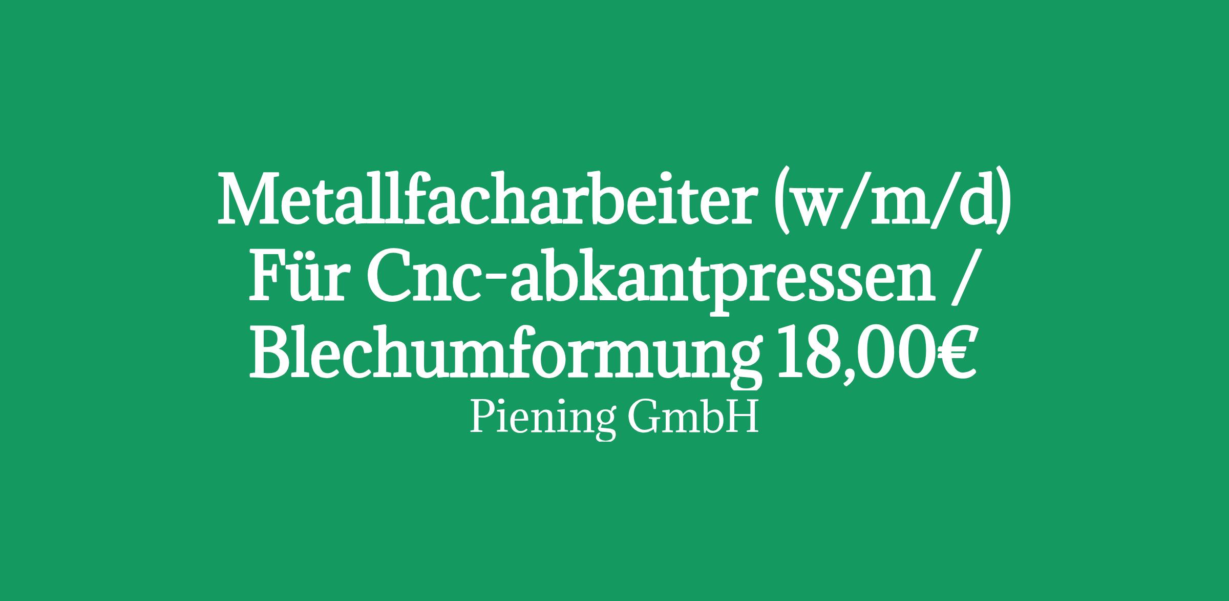 Sie suchen eine neue berufliche Herausforderung als Metallfacharbeiter (w/m/d) für CNC-Abkantpressen / Blechumformung? Dann sind Sie bei Piening Personal genau richtig! Für unseren Kunden aus der gewerblichen Branche besetzen wir diese spannende Position im Rahmen der Arbeitnehmerüberlassung am Standort Neuss.