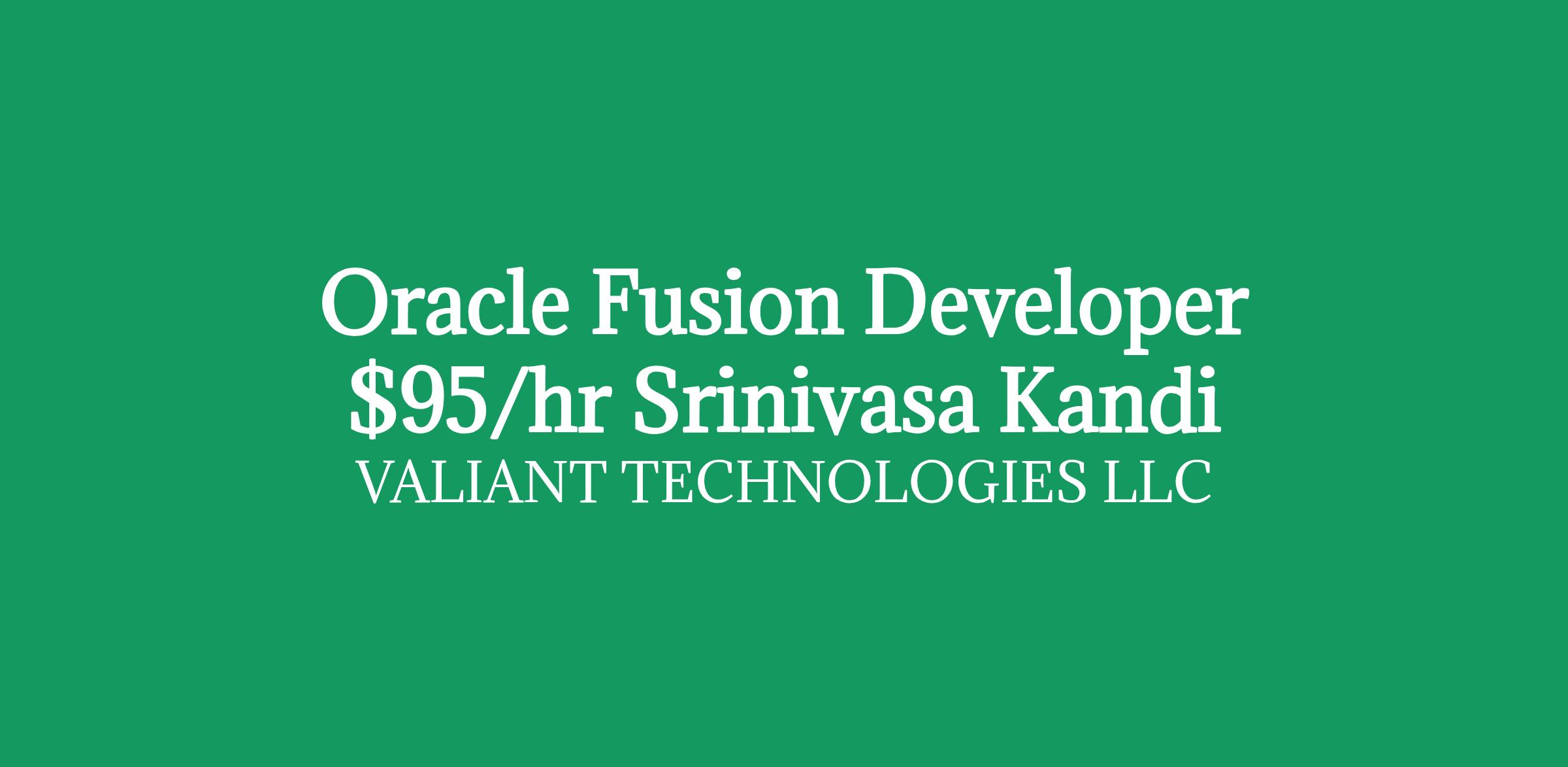 Role: Oracle Fusion Developer Bill Rate: $95/hour C2C Location: Boynton Beach,FL Duration: 12+ months/ long-term Interview Criteria: Telephonic + Skype Direct Client Requirement Job Description: We are looking for a hands-on Senior Oracle Fusion Developer with strong expertise in Supply Chain (SCM), Human Capital Management (HCM), Order-to-Cash (OTC), Aand Record-to-Report (RTR) processes. This role is custom development-focused, requiring the ability to work in multi-vendor environments, manage multiple competing priorities, challenge vendor estimates, and provide L3 production support in a fast-paced setting. The ideal candidate is an out-of-the-box thinker who can design creative solutions without compromising on stability or scalability. Key Responsibilities Develop custom extensions, integrations, and UI components using VBCS, Application Composer, Page Composer, and Flexfields. Build and optimize integrations using Oracle Integration Cloud (OIC), RESTSOAP APIs, BIPOTBI extracts, and FBDIADFdi. Deliver enhancements and automation for SCM, HCM, OTC, and RTR business flows including procurement, inventory, order management, pricing, invoicing, APAR, GL, subledger accounting, core HR, payroll, benefits, and talent management. Create BIPOTBI reports and dashboards ensure high data accuracy and performance. Provide L3 support including defect triage, root cause analysis, and preventive fixes. Work in Agile environments and follow AIM or OUM methodologies for design, build, and delivery. Collaborate with and challenge vendors on estimates, timelines, and solution approaches to ensure efficiency and cost-effectiveness. Required Skills Experience610 years of software development, including 10 years on Oracle Fusion Cloud ERPSCMHCM. Strong in OIC, RESTSOAP APIs, BIP, OTBI, FBDIADFdi, VBCS, SQLPLSQL, performance tuning. Proven delivery in SCM, HCM, OTC, and RTR functional areas. Experience working in multi-vendor environments with multiple concurrent priorities. Hands-on Agile experience familiar with AIM or OUM. Excellent communication and stakeholder engagement skills. Demonstrated ability to think creatively and deliver innovative, out-of-the-box solutions. Ability to negotiate and challenge vendor estimates effectively. Nice to Have Groovy scripting for Fusion custom logic. Event-driven integration patterns advanced error handling. DevOps tools (Git, Jenkins, Azure DevOps, GitHub ActionsWhat We Value Flexibility to adapt to changing priorities. Creative problem-solving mindset for quick and lasting solutions. Vendor management skills to ensure optimal outcomes in cost and delivery. Note: If you are interested, please share your updated resume and suggest the best number & time to connect with you. If your resume is shortlisted, one of our IT Recruiter from my team will contact you as soon as possible Srinivasa Reddy Kandi Client Delivery Manager Valiant Technologies LLC Equal Opportunity Employer: We are an equal opportunity employer. All aspects of employment including the decision to hire, promote, discipline, or discharge, will be based on merit, competence, performance, and business needs. We do not discriminate based on race, color, religion, marital status, age, national origin, ancestry, physical or mental disability, medical condition, pregnancy, genetic information, gender, sexual orientation, gender identity or expression, national origin, citizenship/ immigration status, veteran status, or any other status protected under federal, state, or local law
