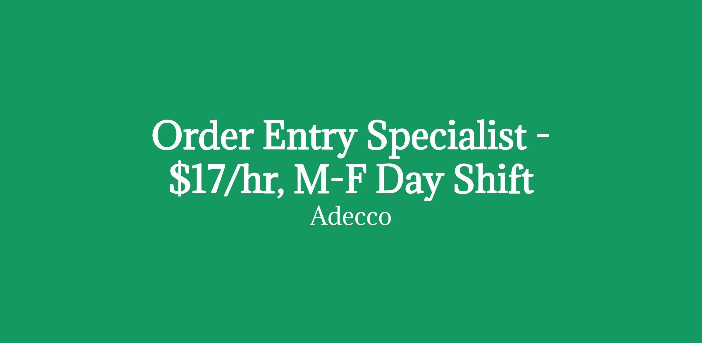Order Entry Specialist - $17/hr, M-F Day Shift