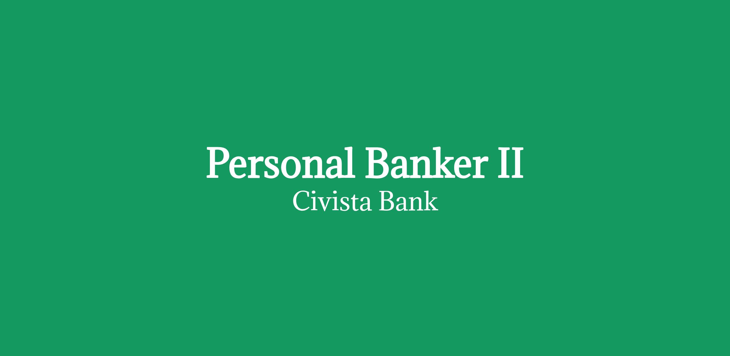 A Personal Banker II (PB II) is responsible for maintaining and building customer relationships by providing an exceptional customer experience. A PB II is also responsible for opening new accounts, completing loan applications and responding to customer inquiries and requests while identifying opportunities to expand current banking relationships. The PB II demonstrates Civista Bank's mission to improve the financial lives of our employees and shareholders, to make a difference in the communities that we serve.