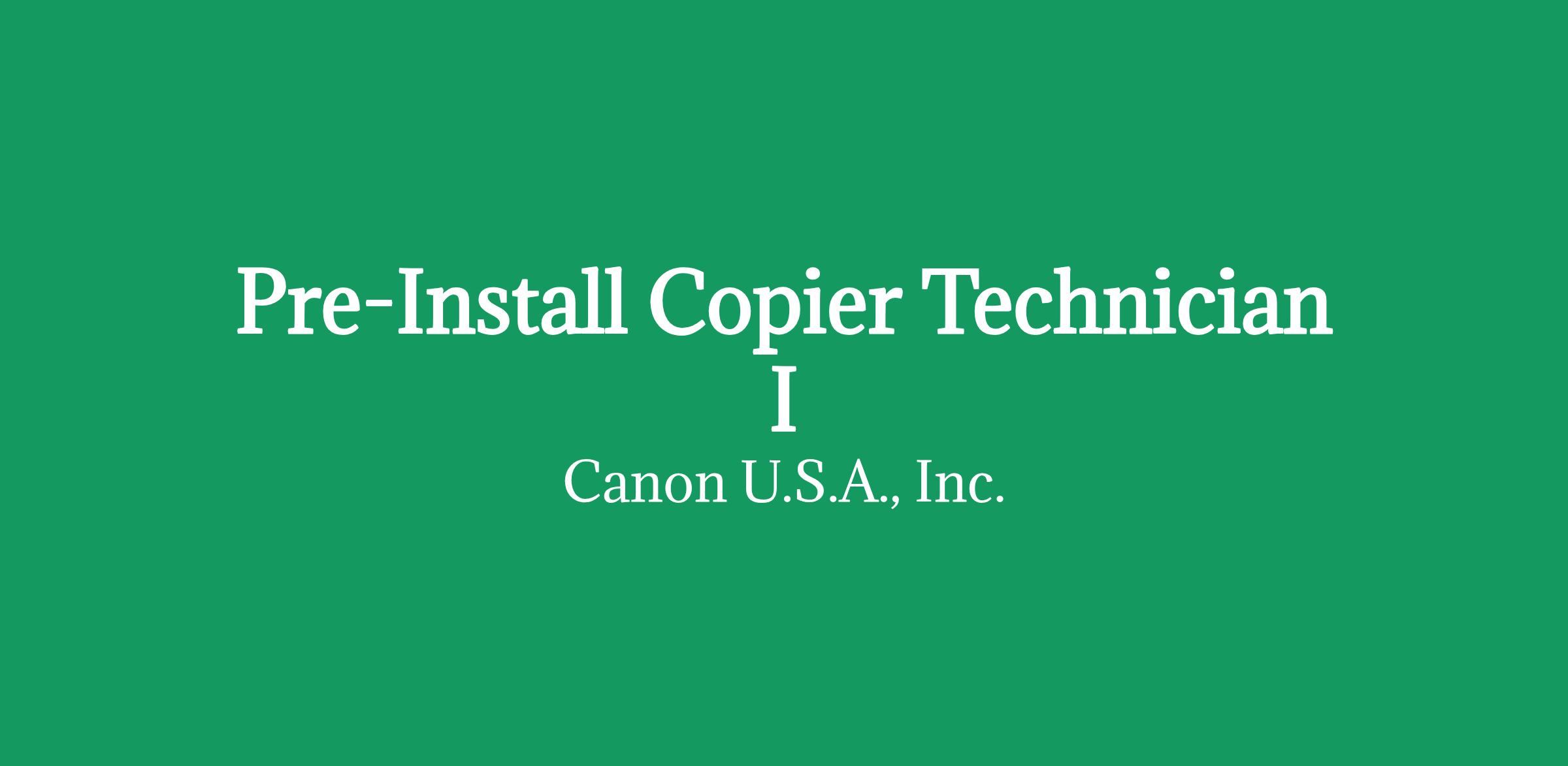 About the Role Canon U.S.A., Inc. in Norcross, GA is seeking a Pre-Install Technician I (Tech, Config/Rem PreInstl I). The Pre-Install Technician I performs basic pre-install and setup of all assigned machines per Canon USA Pre-Install/Configuration Shop Standards. Begins OJT training in configuration. May also be required to complete basic used equipment evaluations. Continues to pursue development of technical skills via Canon training and OJT, and assists in other Logistics areas as assigned.