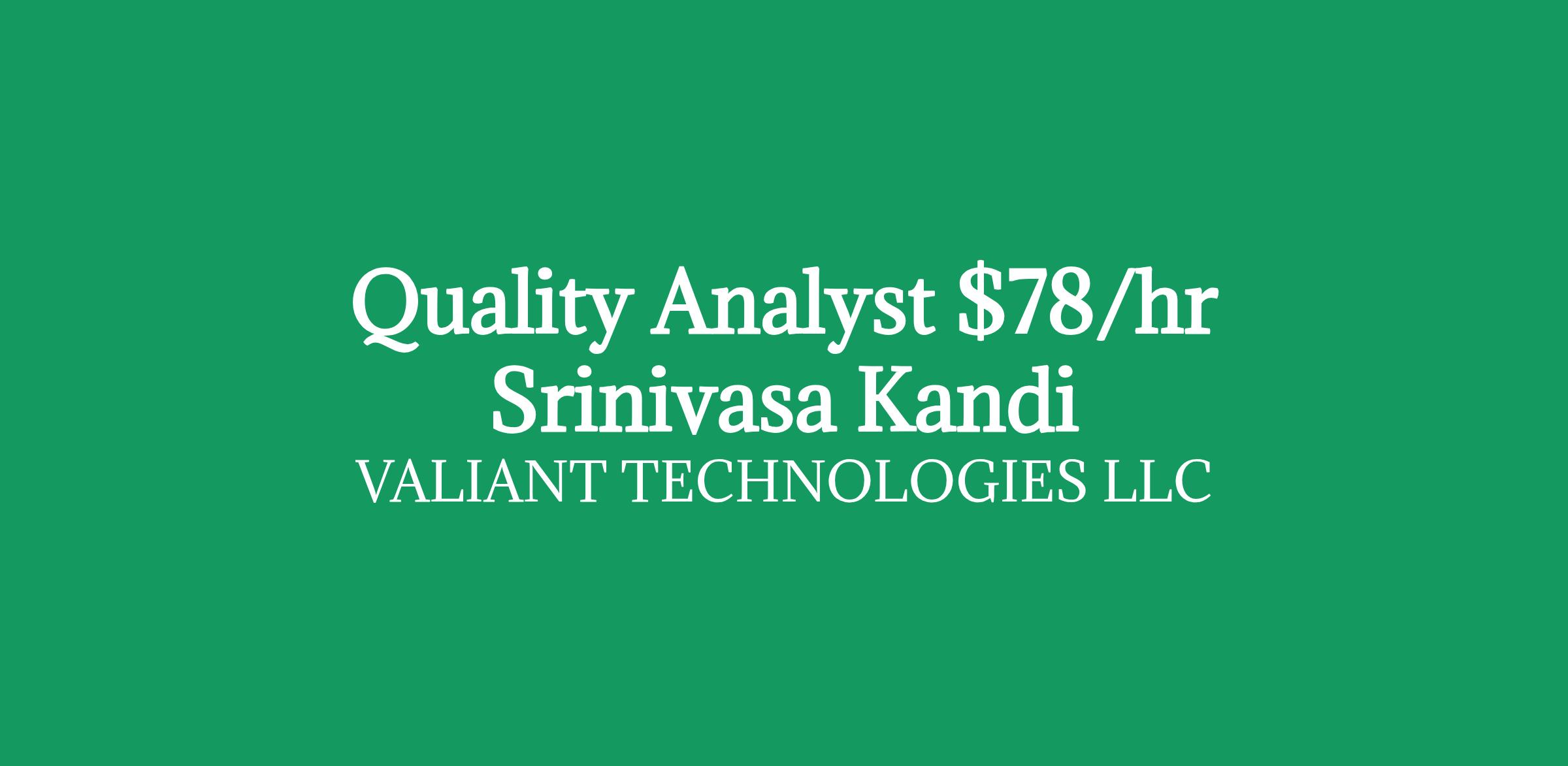 Role: Quality AnalystBill Rate: $78/hour C2CLocation: Richmond, VADuration: 12+ months/ long-termInterview Criteria: Telephonic + ZoomDirect Client Requirement Requirements Qualifications 8 years of Proven work experience in software development and software quality assurance 10 years of Strong knowledge of software QA methodologies, tools and processes 10 years of experience in writing clear, concise and comprehensive test plan and test cases 10 years of Hands-on experience with automated testing tools 8 years of Solid knowledge of SQL and scripting 8 years of Highly skilled in using automation frameworks like Selenium and Playwright 8 years of Strong communication skills to effectively collaborate with software developers, project managers, and other team members. 8 years of Ability to work under pressure and adhere to tight deadlines while maintaining high-quality work. 8 years of Maintain and executing automated testing scripts 8 years of Designing and developing automation scripts to validate functionality, accuracy, and efficiency of software product 8 years of Advanced programming skills including automation systems 8 years of Advance Programming skills, a keen eye for details 8 years of Design and prioritize automation scenarios, building comprehensive test suites to ensure product quality and reliability. 8 years of Develop and maintain robust automation scripts 8 years of Hands-on experience of creating test solution from scratch. 8 years of Experience scripting using Visual Studio Test Edition with Selenium plug-in and Playwright BS/MS degree in Computer Science, Engineering or a related subject 8 years of Experience using JIRA and Zephyr plug in for test script management and execution Note: If you are interested, please share your updated resume and suggest the best number & time to connect with you. If your resume is shortlisted, one of our IT Recruiter from my team will contact you as soon as possible Srinivasa Reddy Kandi Client Delivery Manager Valiant Technologies LLC Equal Opportunity Employer: We are an equal opportunity employer. All aspects of employment including the decision to hire, promote, discipline, or discharge, will be based on merit, competence, performance, and business needs. We do not discriminate based on race, color, religion, marital status, age, national origin, ancestry, physical or mental disability, medical condition, pregnancy, genetic information, gender, sexual orientation, gender identity or expression, national origin, citizenship/ immigration status, veteran status, or any other status protected under federal, state, or local law