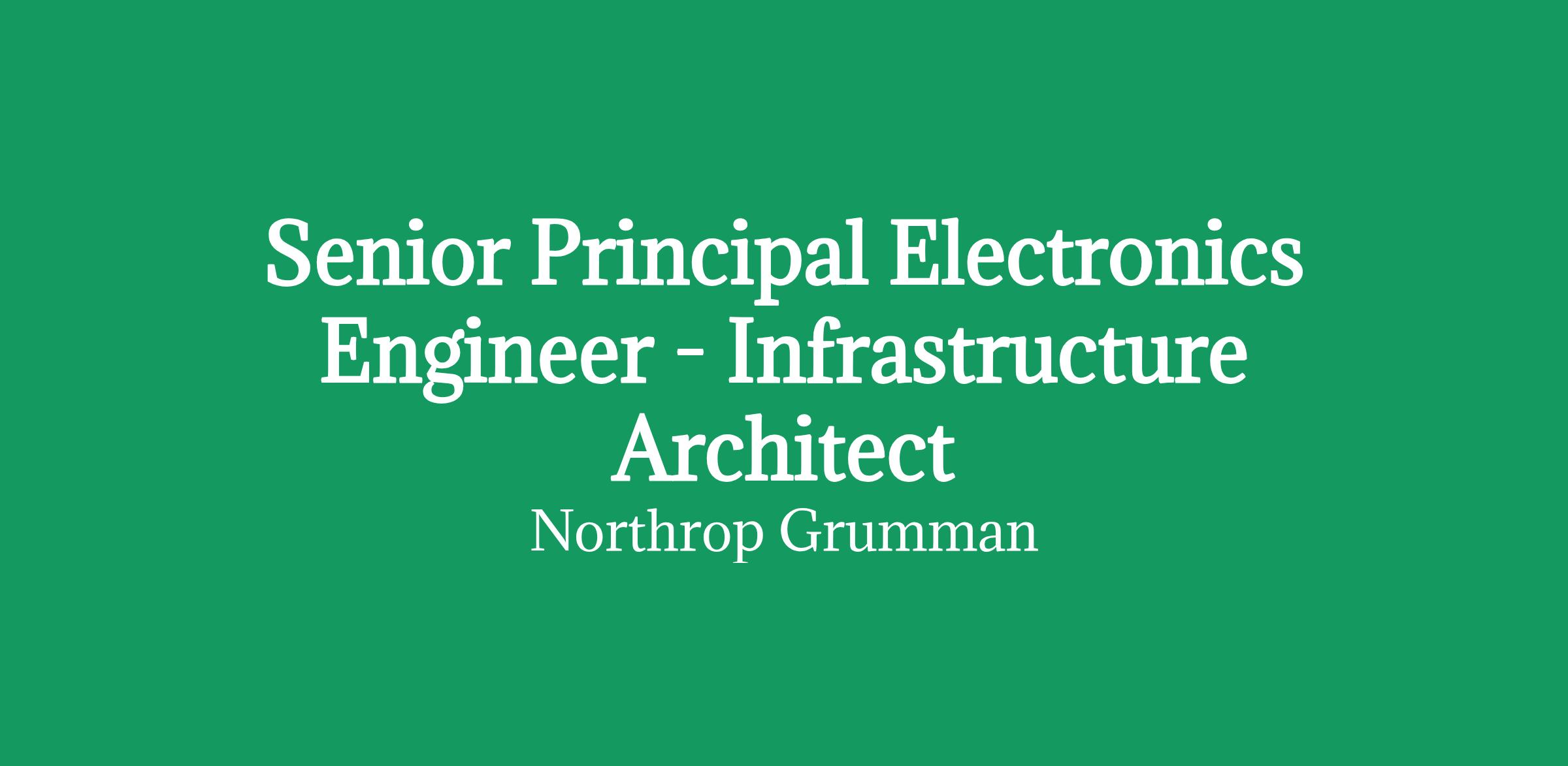 Northrop Grumman Aeronautics Systems is looking to add a Senior Principal Electronics Engineer - Infrastructure Architect to our team in Rancho Bernardo, CA or Palmdale, CA, depending upon the selected candidate's preference. The candidate should have familiarity working in an Integrated Product Team construct.