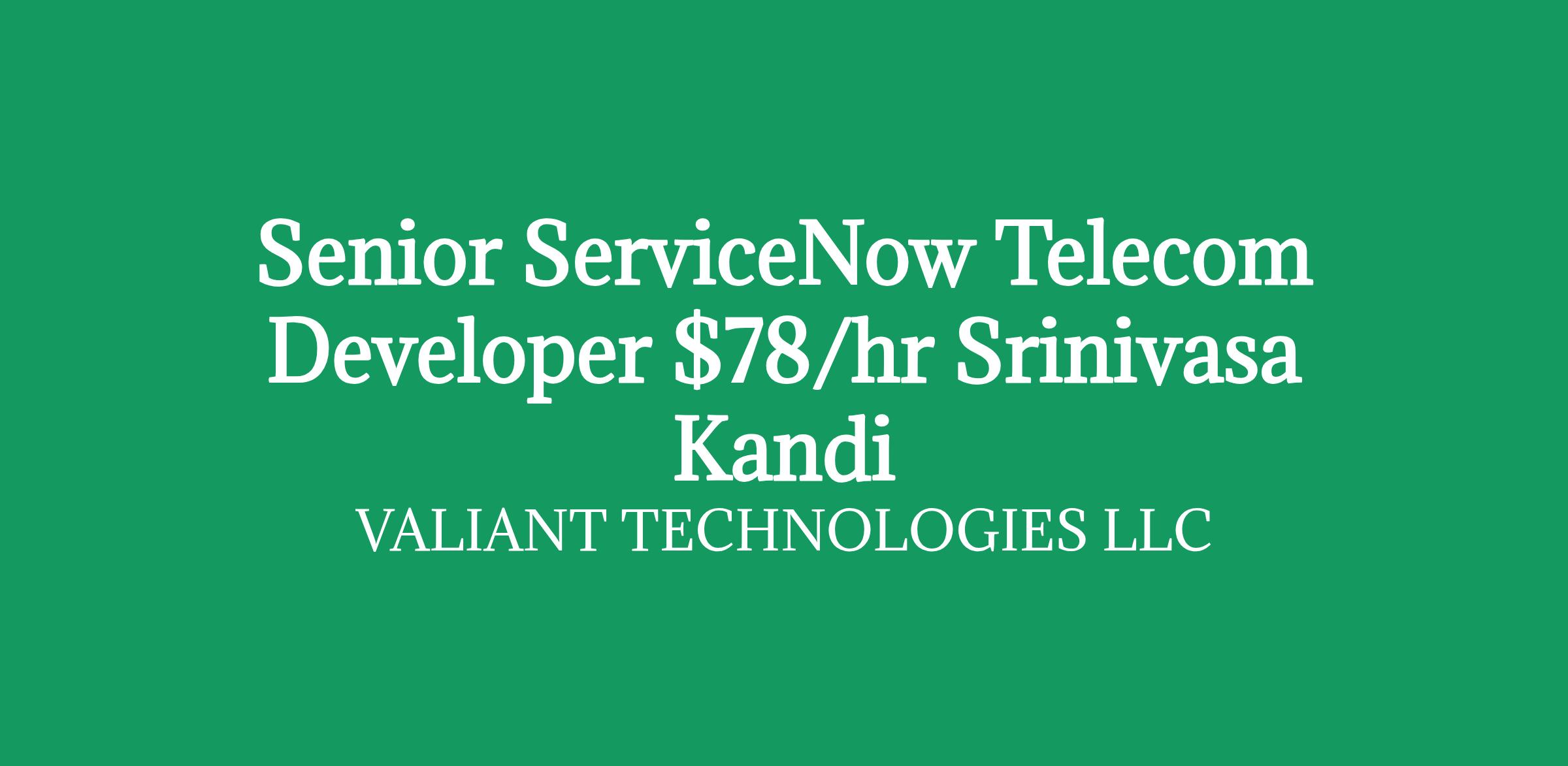 Role: Senior ServiceNow Telecom DeveloperBill Rate: $78/hour C2CLocation: Reston, VADuration: 12+ months/ long-term Interview Criteria: Telephonic +ZoomDirect Client Requirement TOP HARD SKILLS ServiceNow Telecom Order Management (OMT, TSOM, TSM, TNI, CMDB, SOMT): 7+ years Integrations Hub/Flow Designer: 7+ years ServiceNow Telecom Industry Experience: 7+ years NICE-TO-HAVES ServiceNow Migration ServiceNow ITOM Event Management (Expert - P4) Certification (CSA / CAD / CIS) DAY-TO-DAY RESPONSIBILITIES Develop and configure applications based on design recommendations from architects/Tech Leads. Serve as a technology subject matter expert and collaborate with and manage the development team. Engage with multiple teams and contribute to key development decisions. Develop innovative application solutions that enhance user experience and streamline processes. Conduct thorough testing and validation of applications to ensure functionality and performance. Integrate ServiceNow with other enterprise systems using APIs, web services, and integration tools. Create and maintain technical documentation for developed solutions, workflows, and configurations. TOP 3 REQUIRED SKILLS ServiceNow Telecom Order Management (OMT, TSOM, TSM, TNI, CMDB, SOMT): 7+ years Integrations Hub/Flow Designer: 7+ years Overall ServiceNow Development/Implementation: 7+ years (specifically with Telecom industry experience) ADDITIONAL DESIRED SKILLS ServiceNow Migration ServiceNow ITOM Event Management CSA / CAD / CIS Certification IDEAL CANDIDATE PROFILE The ideal candidate is a CL 09 level Senior ServiceNow Developer with a strong engineering or IT background and mandatory deep experience (7+ years) in ServiceNow's Telecom modules. They must be capable of independent development, configuration, testing, and leading technical decisions, showing a commitment to collaborative, innovative solution delivery. Job Responsibilities Develop and configure applications based on design recommendations from architects/Tech Leads. Serve as a technology subject matter expert and collaborate with and manage the development team. Engage with multiple teams and contribute to key development decisions. Develop innovative application solutions that enhance user experience and streamline processes. Conduct thorough testing and validation of applications to ensure functionality and performance. Integrate ServiceNow with other enterprise systems using APIs, web services, and integration tools. Create and maintain technical documentation for developed solutions, workflows, and configurations. Note: If you are interested, please share your updated resume and suggest the best number & time to connect with you. If your resume is shortlisted, one of our IT Recruiter from my team will contact you as soon as possible Srinivasa Reddy Kandi Client Delivery Manager Valiant Technologies LLC Equal Opportunity Employer: We are an equal opportunity employer. All aspects of employment including the decision to hire, promote, discipline, or discharge, will be based on merit, competence, performance, and business needs. We do not discriminate based on race, color, religion, marital status, age, national origin, ancestry, physical or mental disability, medical condition, pregnancy, genetic information, gender, sexual orientation, gender identity or expression, national origin, citizenship/ immigration status, veteran status, or any other status protected under federal, state, or local law