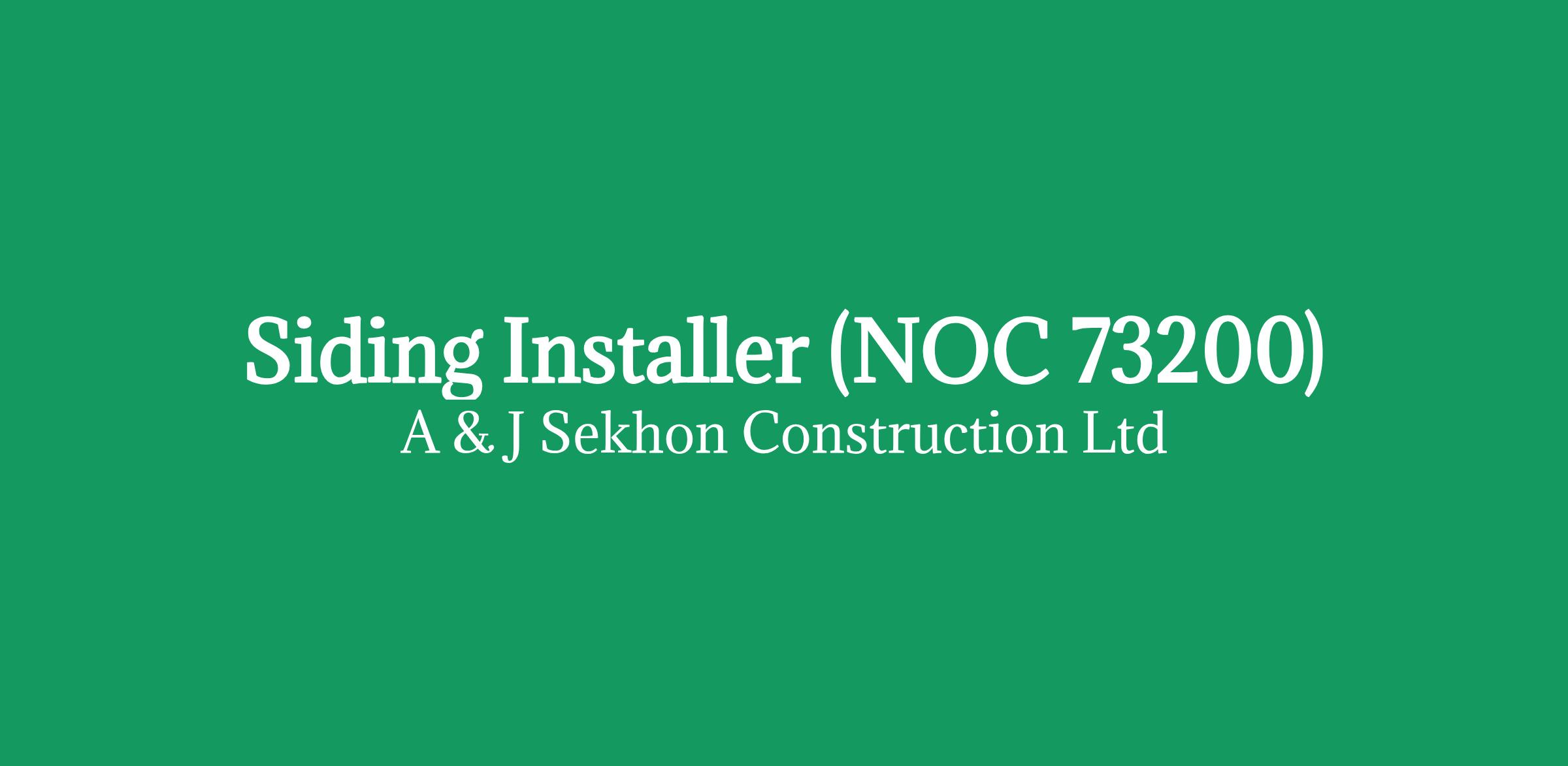 NOC Job Title: Siding Installer (NOC 73200) Company Name: A & J Sekhon Construction Ltd Location: Base at Unit 112, Street, Surrey, BC, Canada, V3W 0M8 Job Type: Full Time, Permanent Salary: $37.00 per hour/ 32 to 40 hours per week Positions Available: 2 Education: Completion of High School Experience: 7 months to 1 year Language: English Start Date of Employment: As soon as possible Work Conditions and Physical Capabilities Fast-paced environment; Physically demanding; Attention to detail; Handling heavy loads; Repetitive tasks Job Description: Install exterior prefabricated products Read blueprints, drawings and specifications to determine work requirements Repair and service exterior prefabricated products Repair and service interior prefabricated products Determine layout and installation procedures Measure and mark guidelines to be used for installations Load and unload trucks with supplies and equipment Utilize hand and power tools Prepare and maintain work materials and supplies How to Apply: Please email your resume along with contact details to or by mail: Unit 112, Street, Surrey, BC, Canada, V3W 0M8
