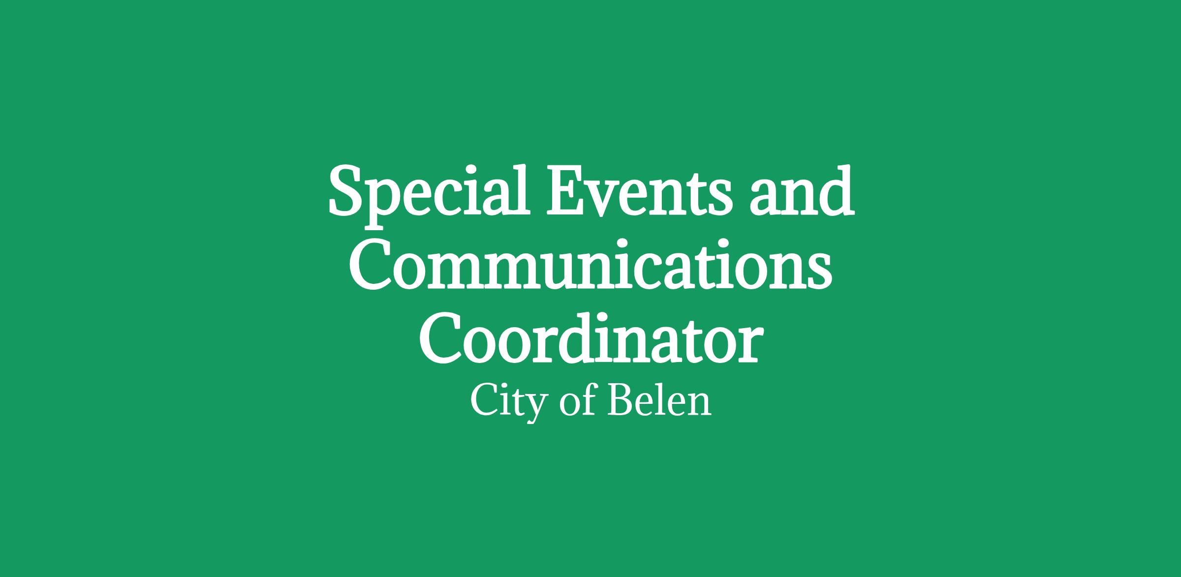 GENERAL PURPOSE:The Special Events and Communications Coordinator is responsible for planning, organizing, executing, and managing all facets of City of Belen Parks and Recreation Department events and festivals. This position serves as the primary liaison between the City and community partners, including but not limited to the Greater Belen Chamber of Commerce, local businesses, school districts, downtown organizations, and volunteer groups, to foster collaboration, sponsorship, and engagement. In addition to managing events, this position oversees the department's website and all forms of print and digital communications, ensuring timely, accurate, and engaging information. The position includes marketing responsibilities to support the promotion of parks, facilities, and programs, as well as soliciting sponsors for community events.