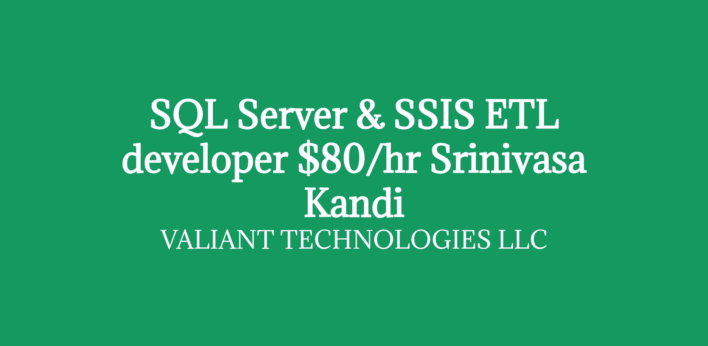 Role: SQL Server & SSIS ETL developer Bill Rate: $80/hour C2CLocation: Warren, NJDuration: 12+ months/ long-term Interview Criteria: Telephonic + ZoomDirect Client Requirement Job Description -1. Lead and guide developers responsible for ETL development, data pipelines, and data warehouse loads.2. Design, develop, and optimize complex SQL queries, stored procedures, functions, and views.3. Build and maintain workflows for data ingestion, cleansing, transformation, and transfer using SQL Server Integration Services (SSIS) and SQL.4. Demonstrated Experience with Microsoft SQL Server 2019 and above including managing databases.5. Demonstrated experience working with Microsoft SSIS to create and deploy packages and deploy for ETL processes.6. Demonstrated experience around writing and troubleshooting T-SQL statements, creating stored procedures, views, and SQL functions.7. Understands different data models like normalized, de-normalized, stars, and snowflake models.8. Strong SQL coding experience with performance optimization experience for data queries.9. Ability to multi-task and thrive in fast paced, rapidly changing, and complex environment.10. Work with team members to identify and resolve technical issues in a timely fashion.11. Analyse problems and communicate with stake holders to assess needs and determine optimal solutions.12. Deep understanding of data warehousing concepts13. Experience using Azure Devops and CICD pipeline for deployments14. Strong understanding of data structures and formats such as JSON and XML and SSIS Scripting. Note: If you are interested, please share your updated resume and suggest the best number & time to connect with you. If your resume is shortlisted, one of our IT Recruiter from my team will contact you as soon as possible Srinivasa Reddy Kandi Client Delivery Manager Valiant Technologies LLC Equal Opportunity Employer: We are an equal opportunity employer. All aspects of employment including the decision to hire, promote, discipline, or discharge, will be based on merit, competence, performance, and business needs. We do not discriminate based on race, color, religion, marital status, age, national origin, ancestry, physical or mental disability, medical condition, pregnancy, genetic information, gender, sexual orientation, gender identity or expression, national origin, citizenship/ immigration status, veteran status, or any other status protected under federal, state, or local law