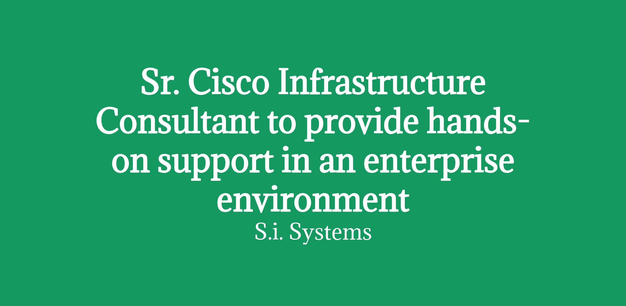 Our valued client is looking for a Sr. Cisco Infrastructure Consultant to provide hands-on support in an enterprise environment.