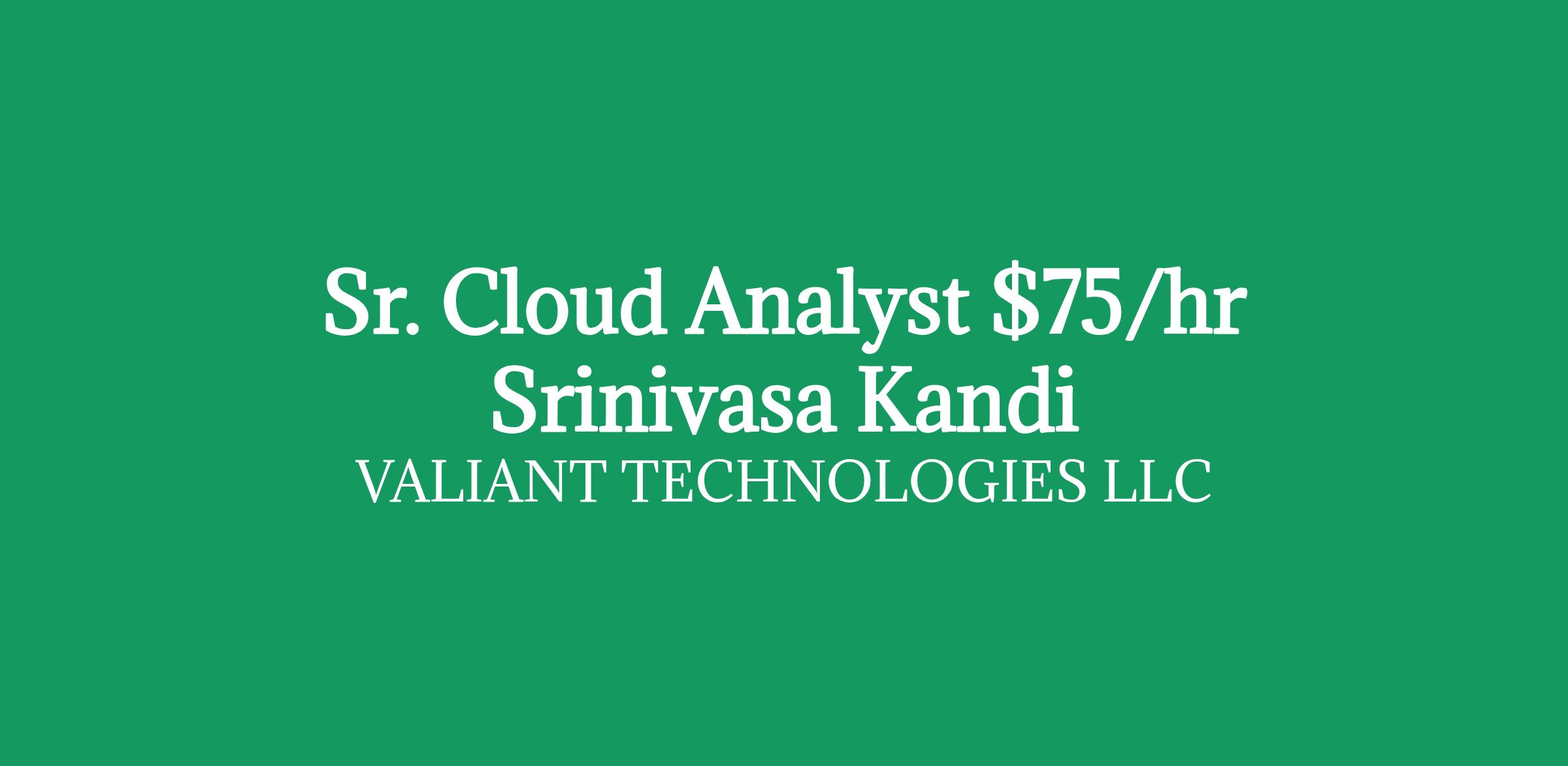 Role: Sr. Cloud AnalystBill Rate: $75/hour C2CLocation: Dallas,TXDuration: 12+ months/ long-term Interview Criteria: Telephonic +ZoomDirect Client Requirement What we're looking forMust Haves:4 Year/Bachelor's degree (or equivalent) in Computer Science, Computer Information Systems, Information Systems, Information Technology or Computer Engineering5+ Years experience in application development and architecture that directly aligns with the specific responsibilities for this position4+ yrs expertise in Cloud (must be AWS certified) and 5+ yrs experience & proficiency in IBM-MainframesExperience hosting applications with the tech-stack of - Microfocus-COBOl, JCL & CICS, DB2-LUW, MicroFocus Ent Server, DB2 connectivityAt least 1 full cycle execution of Mainframe to AWS migrationMainframe and AWS communication & Integration:SNA ArchitectureData Transfer protocols (IBM connect direct, SFG Mailbox or similar)LRS printing tool integration with Microfocus & printersLDAP and setting up one-way trust to Active-DirectoryNice to Haves:AWS Solutions Architect Professional certification Note: If you are interested, please share your updated resume and suggest the best number & time to connect with you. If your resume is shortlisted, one of our IT Recruiter from my team will contact you as soon as possible Srinivasa Reddy Kandi Client Delivery Manager Valiant Technologies LLC Equal Opportunity Employer: We are an equal opportunity employer. All aspects of employment including the decision to hire, promote, discipline, or discharge, will be based on merit, competence, performance, and business needs. We do not discriminate based on race, color, religion, marital status, age, national origin, ancestry, physical or mental disability, medical condition, pregnancy, genetic information, gender, sexual orientation, gender identity or expression, national origin, citizenship/ immigration status, veteran status, or any other status protected under federal, state, or local law