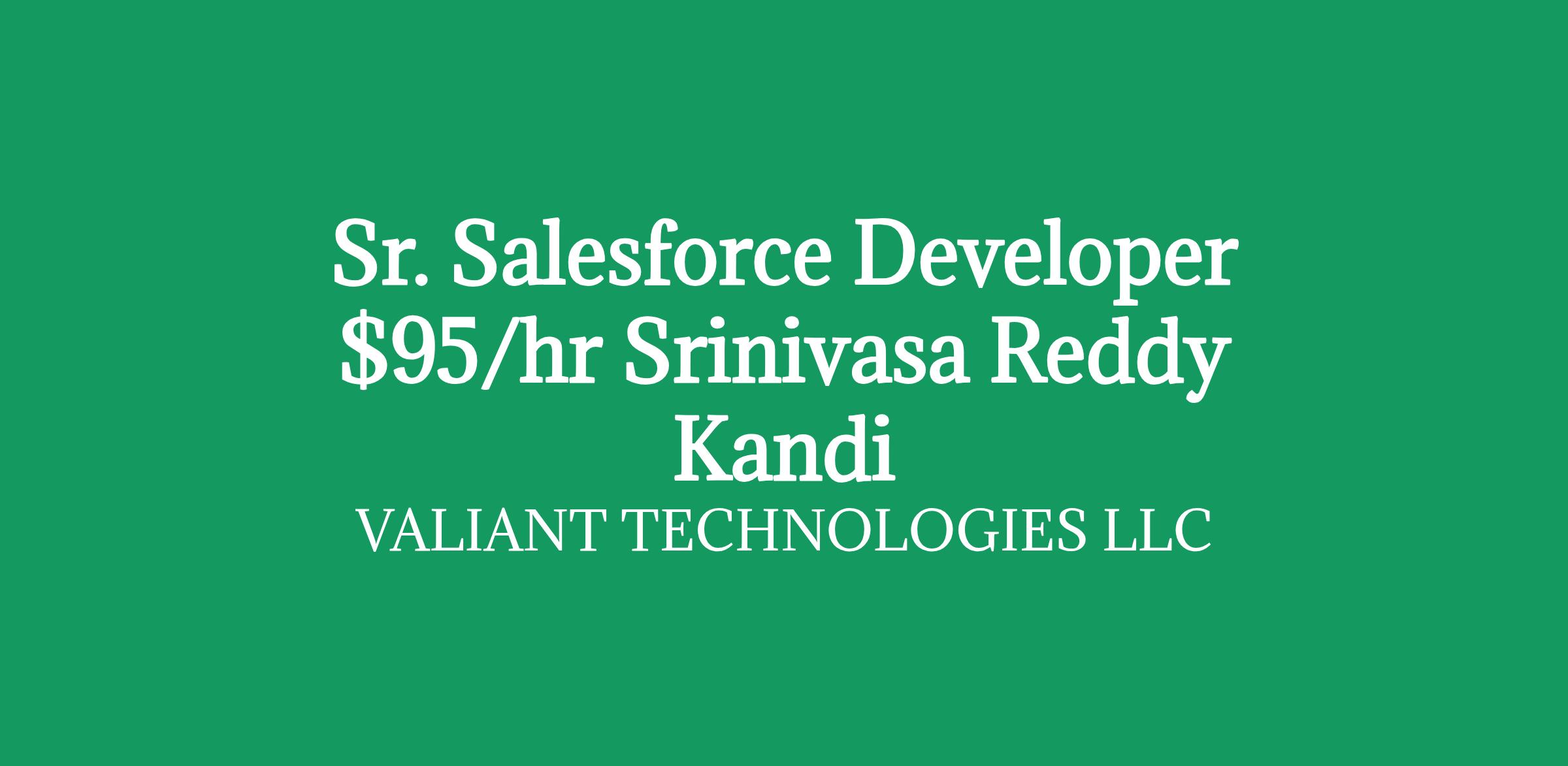 Role: Senior Salesforce Developer Bill Rate: $95/hr C2C Location: Jersey City, NJ Duration: 12+ months/ long-term Interview Criteria: Telephonic + Skype Direct Client Requirement Salesforce Development: Design, develop, and deploy Salesforce applications using Salesforce Apex, Visualforce, Lightning components, and other Salesforce technologies. Customize Salesforce CRM based on client requirements and business processes. Implement security and access controls for Salesforce applications. Integrate Salesforce with other systems using REST, SOAP APIs, and middleware solutions. Create and manage Salesforce reports and dashboards. Perform unit testing, integration testing, and debugging of Salesforce code and applications. Java Development: Develop and maintain backend systems, APIs, and microservices using Java and related technologies (Spring, Hibernate, etc. Design and develop Java-based applications to support business processes and integration with Salesforce. Implement data processing logic, custom algorithms, and business rules in Java. Collaborate with other teams to ensure seamless integration between Salesforce and Java-based systems. Optimize and troubleshoot Java applications for performance, scalability, and reliability. Collaboration & Communication: Work closely with Salesforce Administrators, Business Analysts, and other stakeholders to gather requirements and deliver solutions. Participate in code reviews, training sessions, and mentoring junior developers. Troubleshoot and resolve technical issues in Salesforce and Java applications. Technical Skills:Proven experience as a Salesforce Developer, including working with Apex, Visualforce, Lightning Web Components (LWC), and Salesforce APIs. Strong proficiency in Java development, including frameworks such as Spring, Hibernate, and J2EE technologies. Experience in integrating Salesforce with third-party systems using REST/SOAP APIs. Solid understanding of relational databases (SQL, Oracle, etc and data modeling. Experience with version control systems (Git, SVN, etc and development tools. Familiarity with Agile/Scrum development methodologies. Soft Skills:Strong problem-solving and analytical skills. Excellent communication skills to work with cross-functional teams. Ability to work independently and as part of a team. Detail-oriented with a focus on delivering high-quality solutions Note: If you are interested, please share your updated resume and suggest the best number & time to connect with you. If your resume is shortlisted, one of our IT Recruiter from my team will contact you as soon as possible. Srinivasa Reddy Kandi Client Delivery Manager Valiant Technologies LLC Equal Opportunity Employer: We are an equal opportunity employer. All aspects of employment including the decision to hire, promote, discipline, or discharge, will be based on merit, competence, performance, and business needs. We do not discriminate based on race, color, religion, marital status, age, national origin, ancestry, physical or mental disability, medical condition, pregnancy, genetic information, gender, sexual orientation, gender identity or expression, national origin, citizenship/ immigration status, veteran status, or any other status protected under federal, state, or local law.