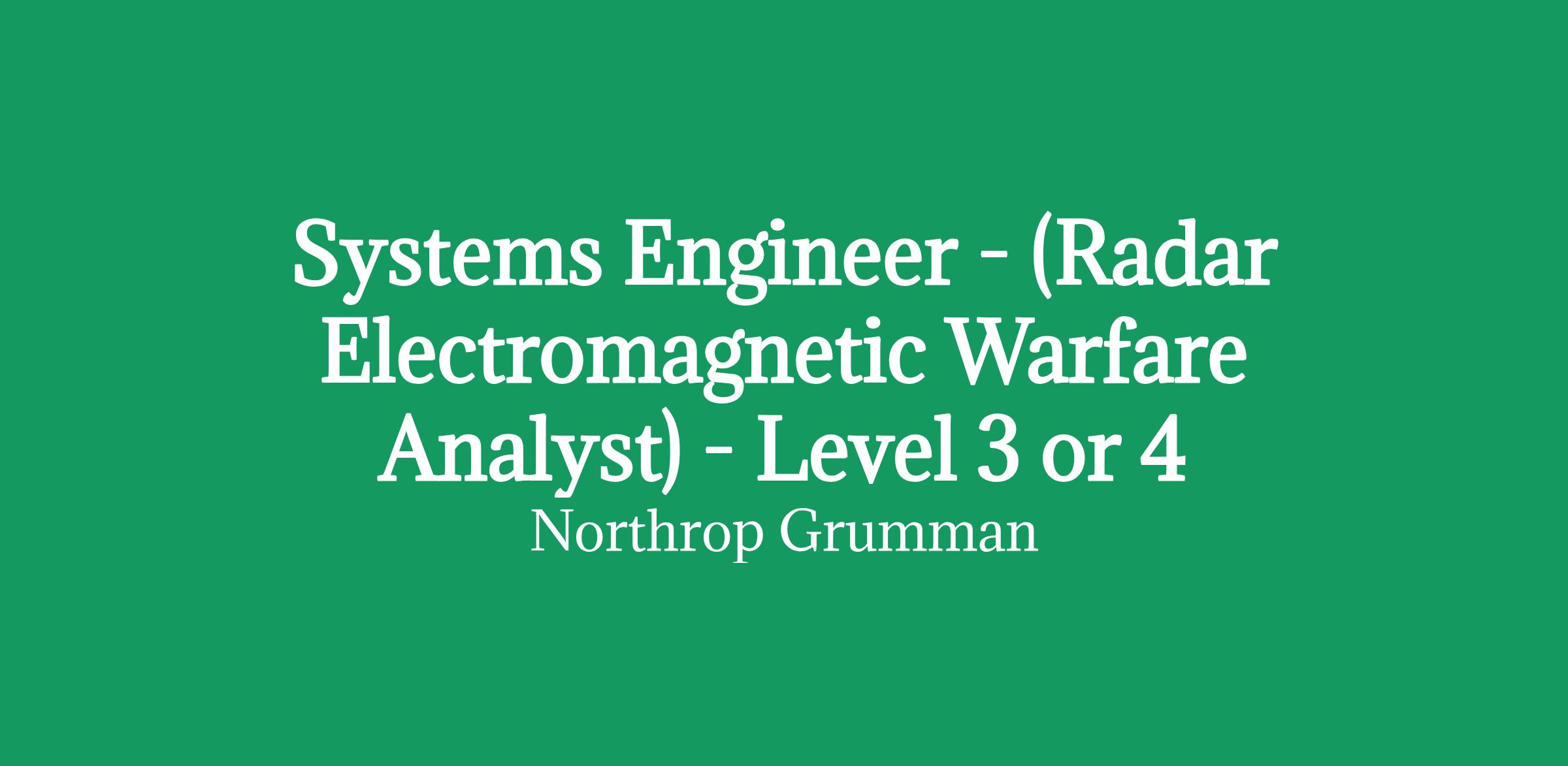 Northrop Grumman Space Systems, Multi-Domain Operations, and Missile Defense Integration Business Unit (BU) has an exciting career opportunity for a Systems Engineer (Radar Electromagnetic Warfare Analyst) - Level 3 or 4 to join our team of qualified, diverse individuals. This position will be in Huntsville, AL.