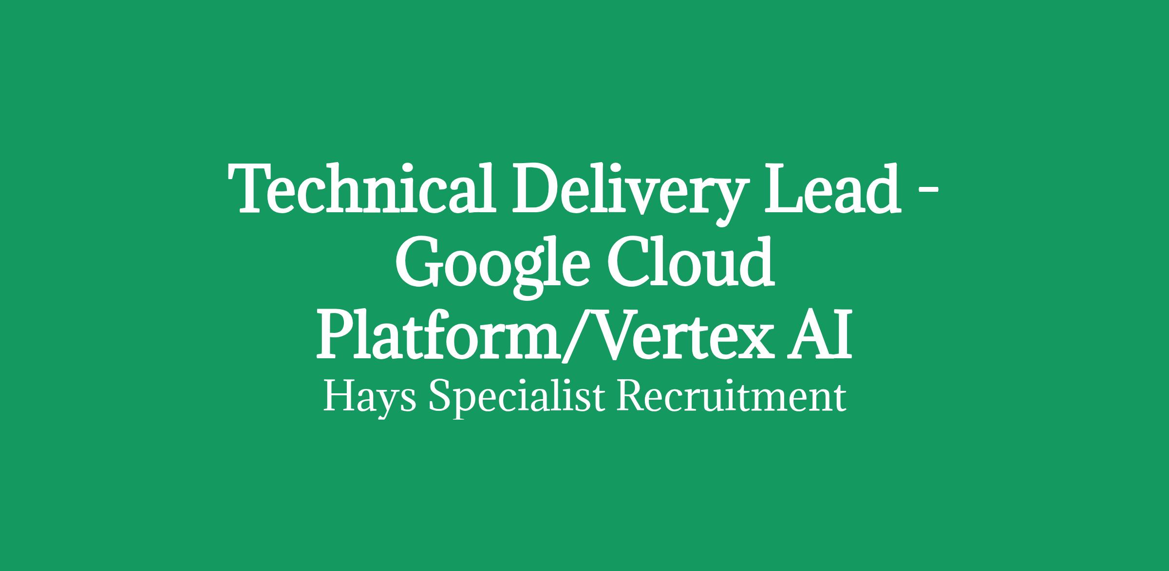Hays have partnered exclusively with a leading telecoms provider to appoint an experienced Technical Delivery Lead to a complex Google Cloud Platform buildout via Vertex AI. They're well and truly at the delivery stage of this project right now, with a vendor chosen and ready to commence their work. If you're an experienced technical delivery professional, with demonstrated success implementing/building out Google Cloud Platform (Vertex AI preferable) and a background in telecoms or similar environments, then we want to hear from you.
